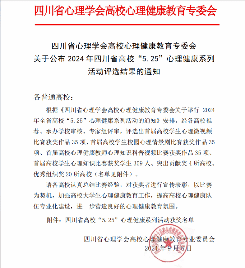 近日,在2024年四川省高校“5·25”心理健康系列活动中,beat365心理微视频作品《推开窗,迎接光》荣获四川省三等奖,23连锁经营与管理班的吴天浩同学、23大数据与会计10班的张恒同学,在心理知识比赛中获奖。2024年四川省高校“5·25”心理健康系列活动由四川省教育厅指导,四川省心理学会高校心理健康教育专业委员会主办。近年来,学院党委高度重视学生心理健康工作,坚持“生命至上、健康第一”的理念,探索构建了教育教学、实践活动、...