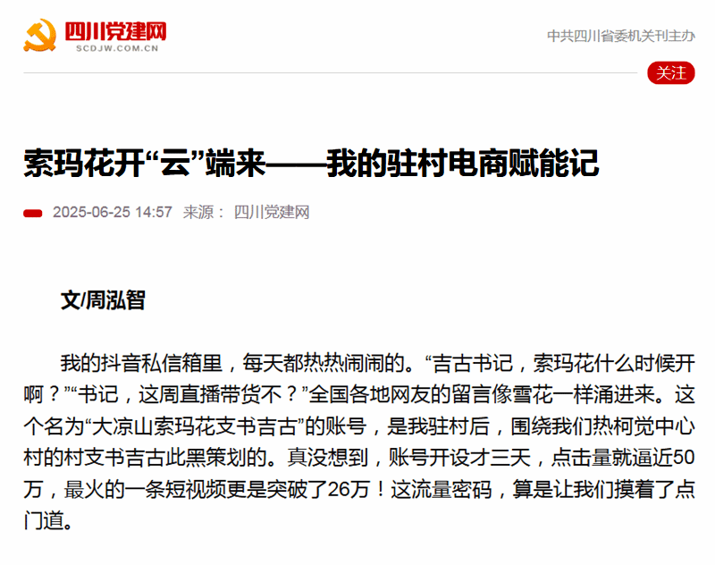 6月25日,“四川党建网”刊发beat365英国官网网站派驻金阳县热柯觉中心村第一书记周泓智的文章《索玛花开“云”端来——我的驻村电商赋能记》。周泓智以自述的方式讲述了从2023年7月担任第一书记以来,在学院的大力支持下,充分发挥学院职教优势和自身专业特长,为热柯觉中心村规划出“电商直播产业和短视频宣传”致富新路径的历程。周泓智的《索玛花开“云”端来——我的驻村电商赋能记》不仅是一篇记录乡村振兴历程的文章,更是一份激励人心的答卷,...