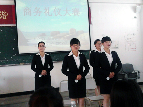 5月20日中午1:00,由学院经营管理系主办,12级文秘班承办的“你的礼仪,价值百万”商务礼仪大赛在2301教室拉开帷幕。