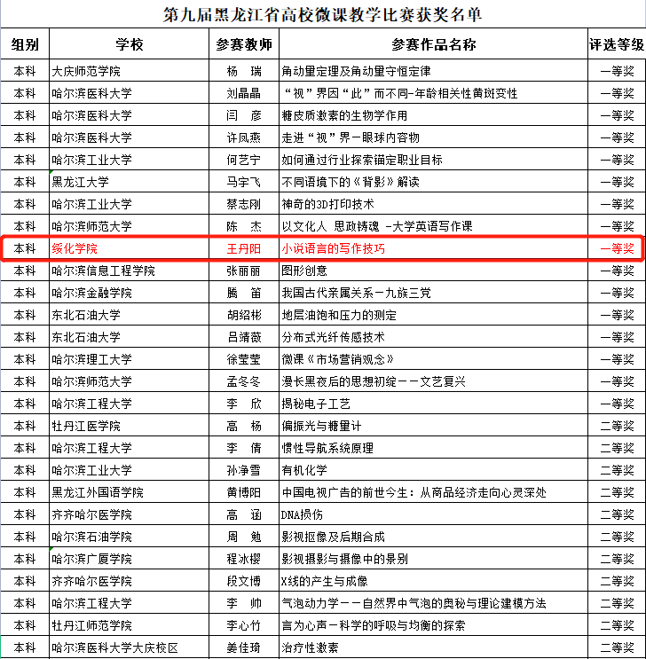 近日,万象城官网王丹阳老师参赛作品《小说语言的写作技巧》获得第九届黑龙江省高校微课教学比赛一等奖。