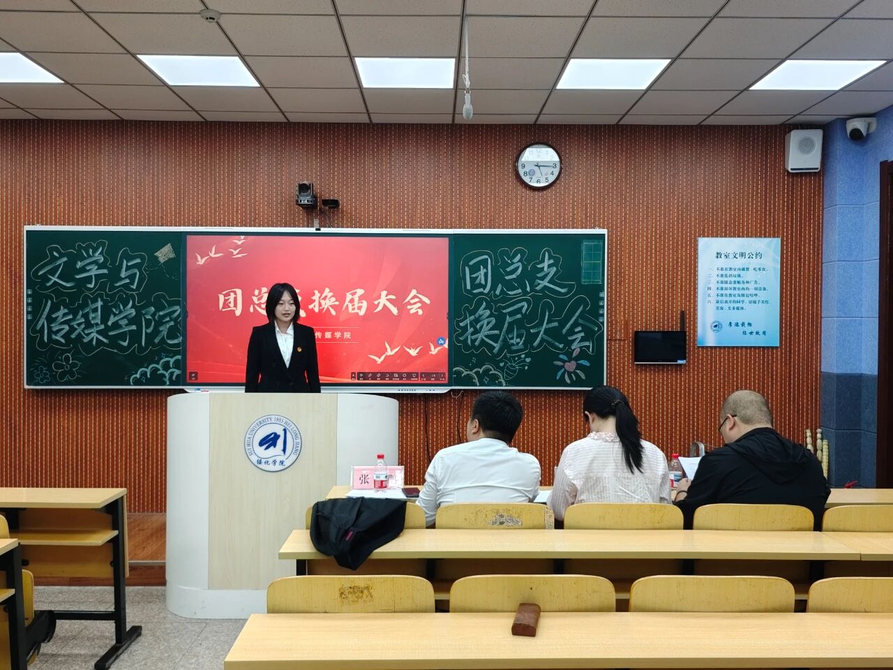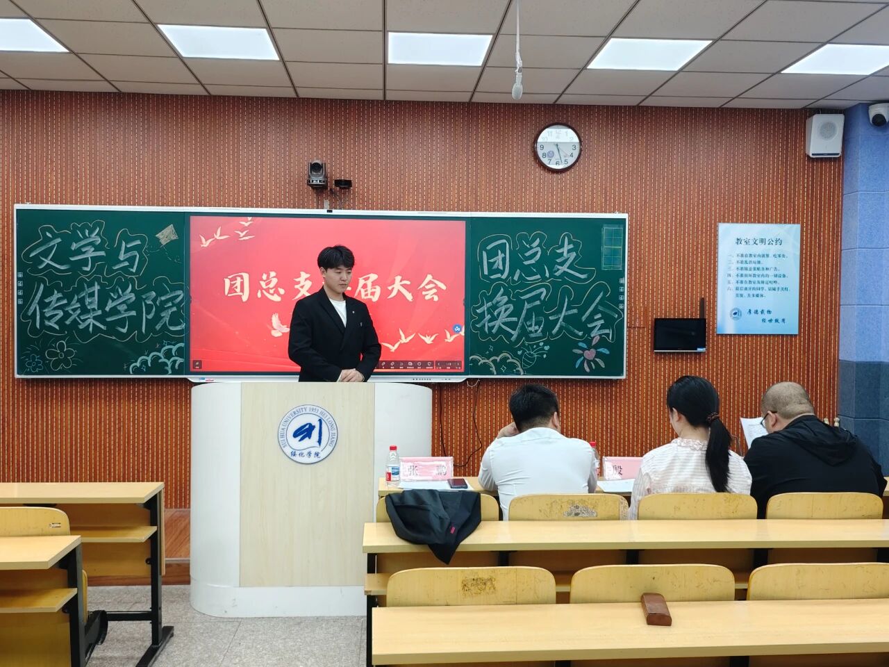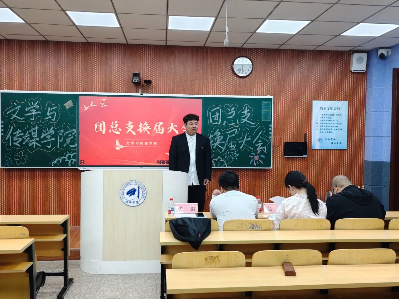 9月24日下午,万象城娱乐awc线路于汇文楼303和305教室召开第十六届团总支学生会换届大会。学院党总支副书记张鹏、2022级辅导员鞠亚林、2023级辅导员于小庆、2024级辅导员殷跃及全体学生干部出席。
