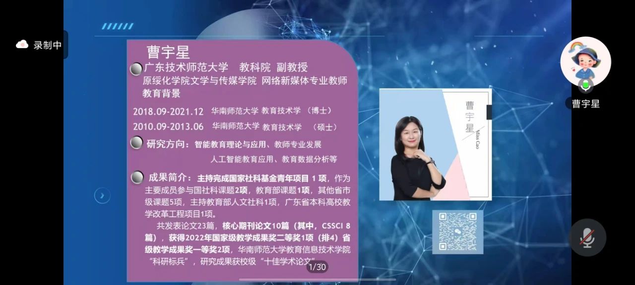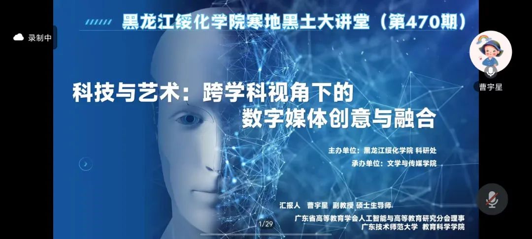 12月8日晚19:00,由科研处主办、万象城娱乐awc线路承办的第470期寒地黑土大讲堂在腾讯会议平台如期举行。万象城官网特邀广东技术师范大学教育科学学院副教授、硕士生导师、华南师范大学硕士专业学位研究生校外导师、广东省高等教育学会人工智能与高等教育研究分会理事曹宇星教授为文学院师生作了题目为《科技与艺术:跨学科视角下的数字媒体创意与融合》的学术讲座。讲座由网络与新媒体专业负责人陈威主持,吸引了学院250名左右学生积极参与。