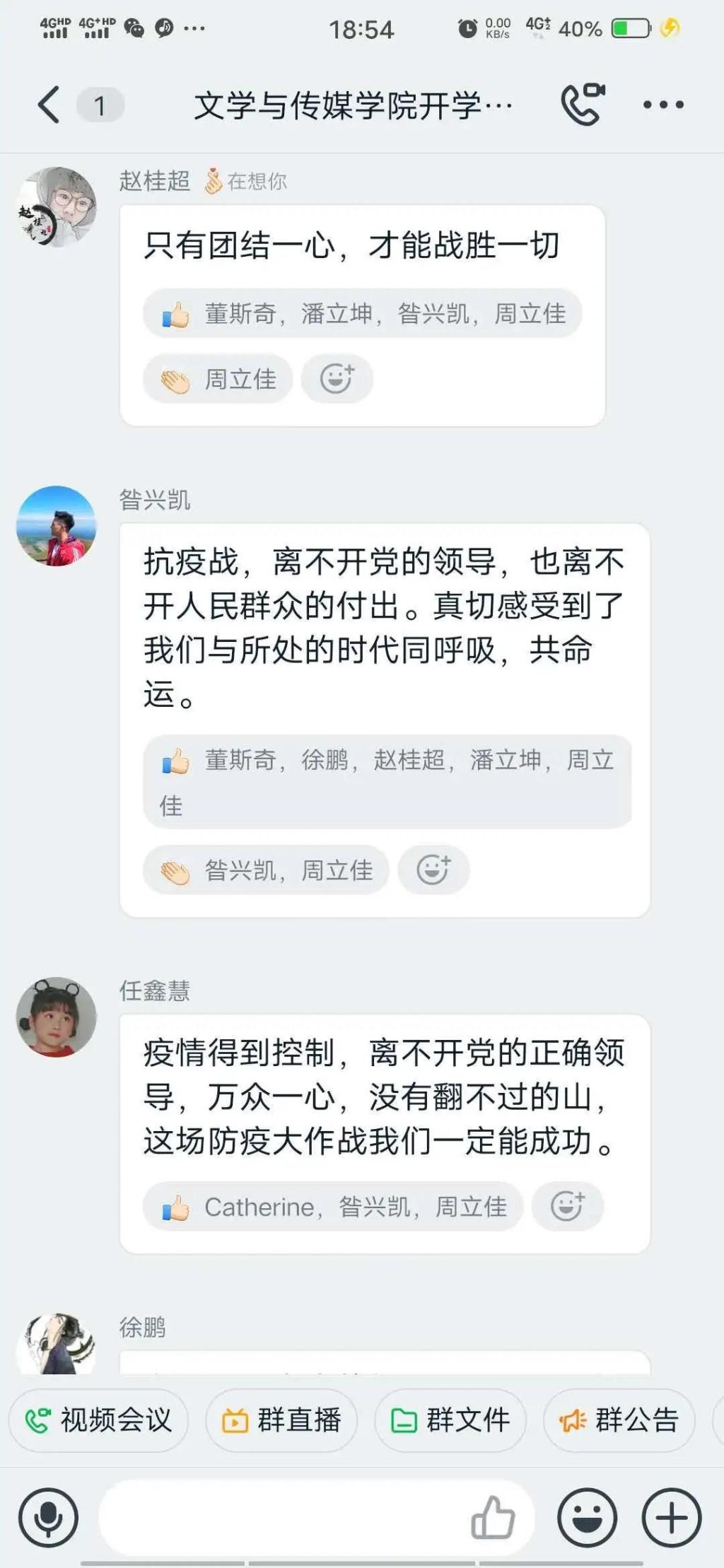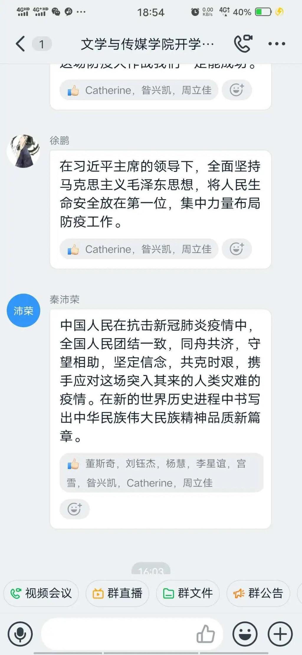 全院学生通过手机、电脑等终端设备在微信直播上同步观看了本次讲座。唐国忠书记生动精彩的课程内容和语重心长的殷切嘱托,给全体同学留下了深刻印象。同学们围坐在寝室里认真聆听,积极互动,纷纷在直播间发起讨论并写下留言,表示要牢固树立爱国主义的高尚情操,锤炼坚强意志品格,保持积极向上的乐观心态,与祖国同行,不负党恩,不辱使命!