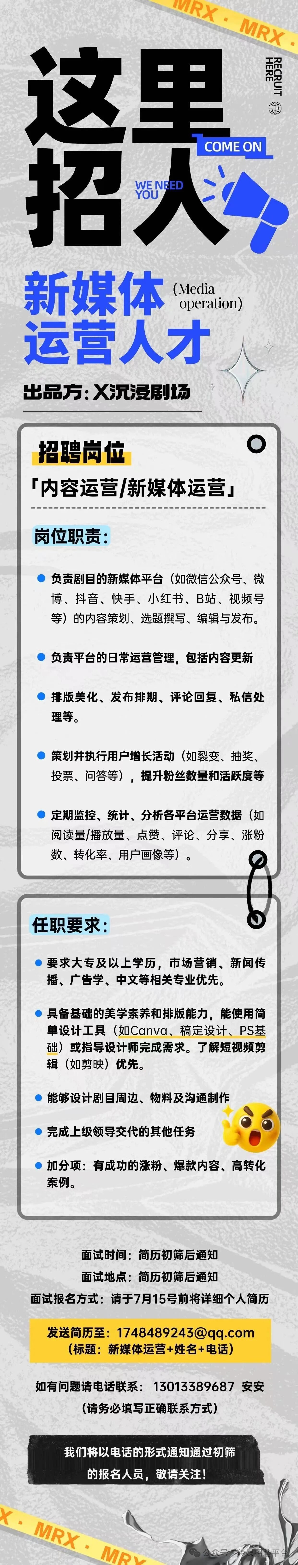 就业指导丨X沉浸剧场招聘内容运营/新媒体运营(北京)