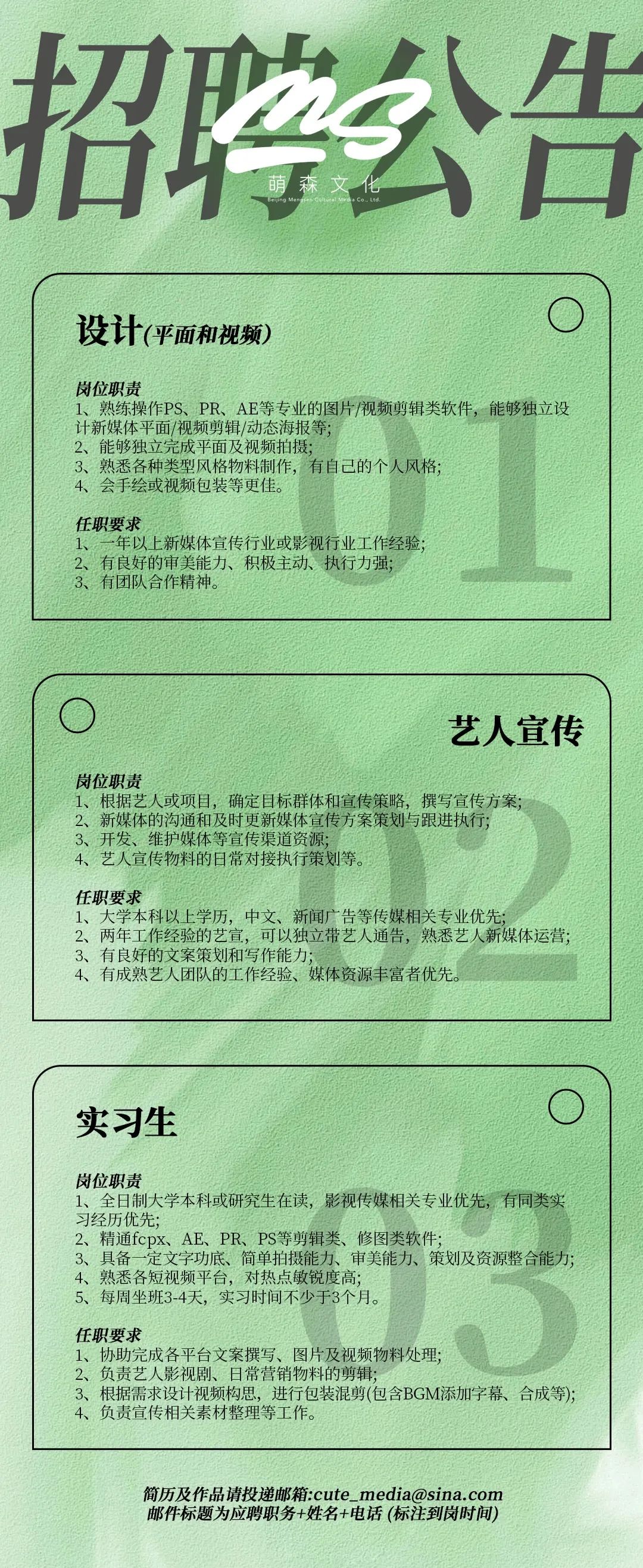 就业指导丨萌森文化招聘设计、艺人宣传、实习生