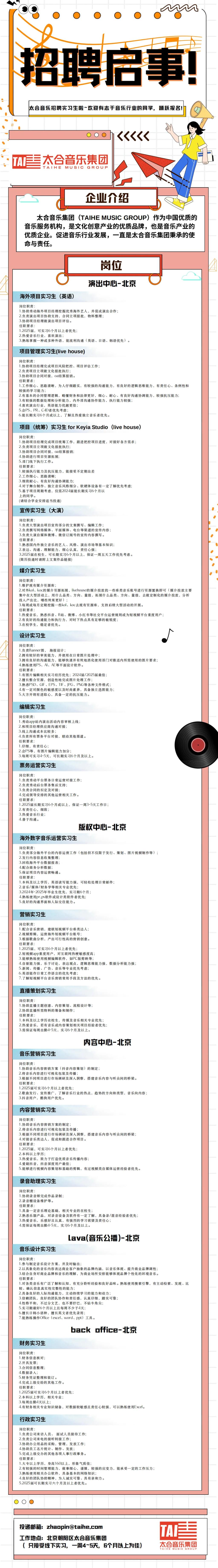 就业指导丨太合音乐多个实习岗位招聘(北京、成都)
