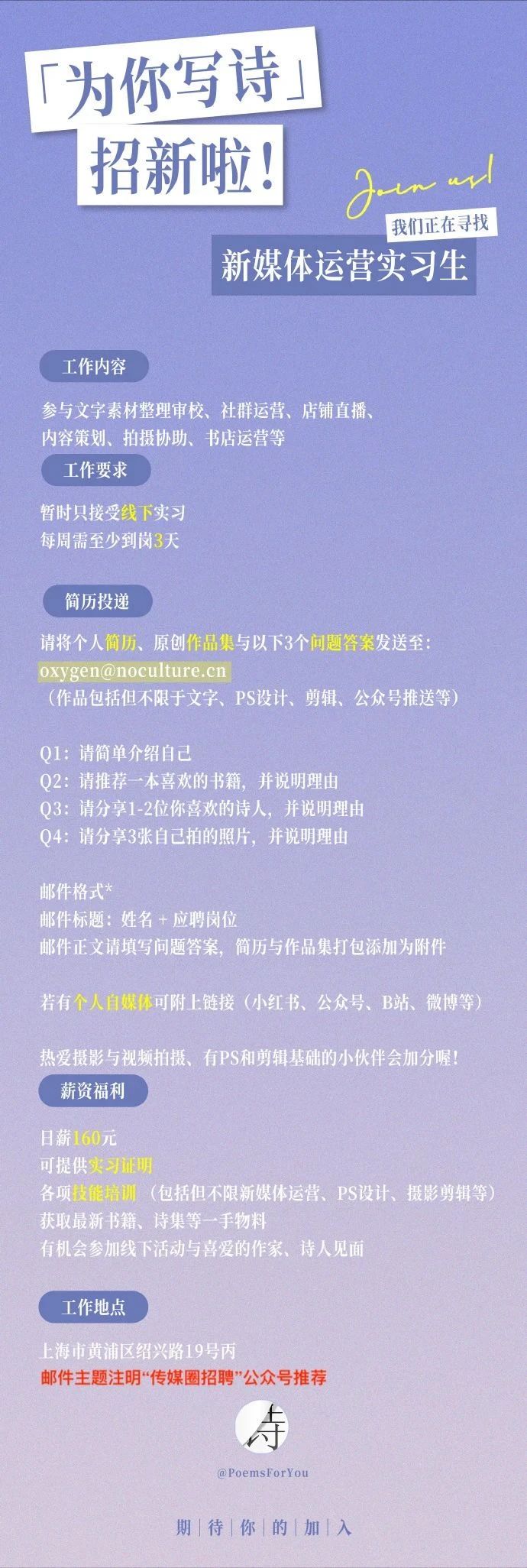 就业指导丨为你写诗招聘新媒体运营实习生!