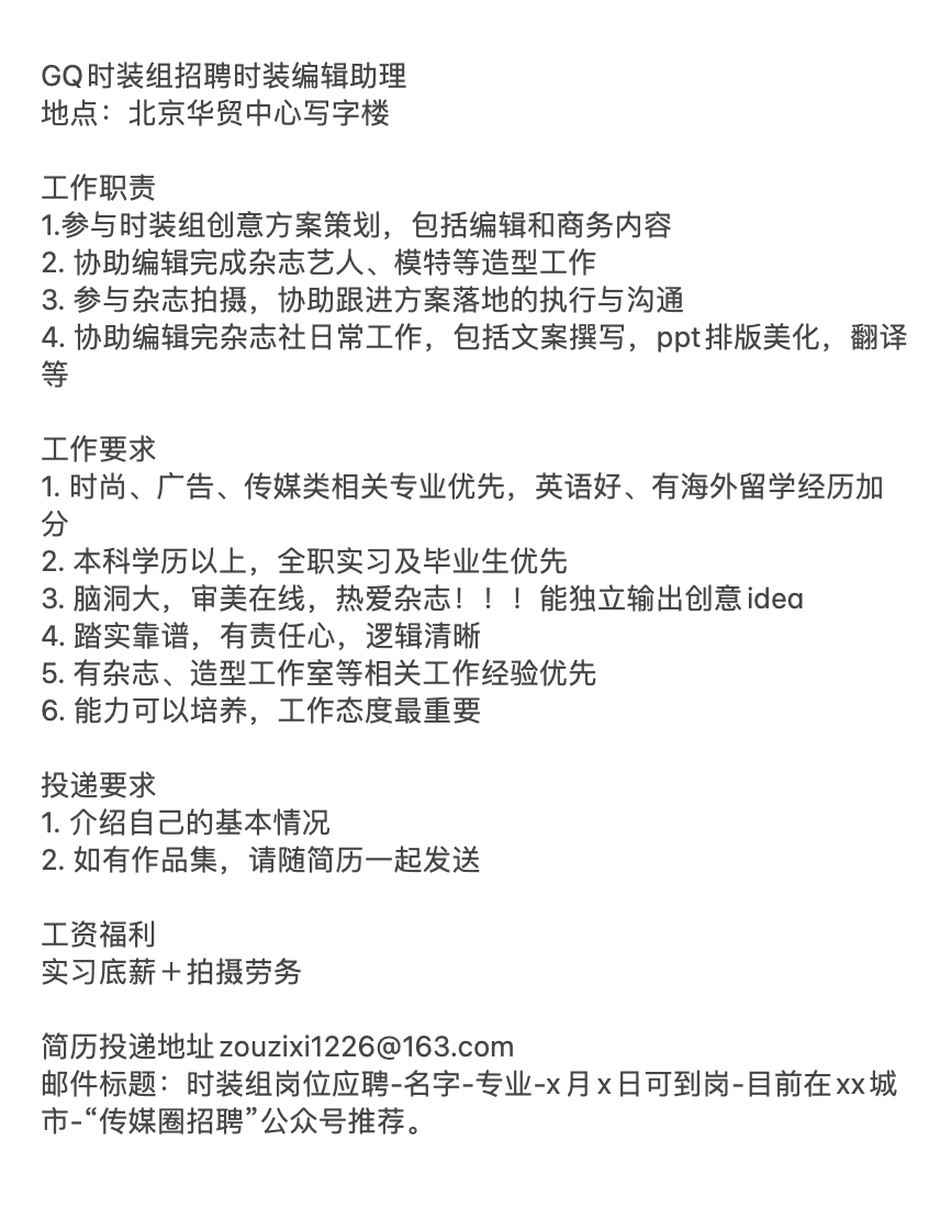 就业指导丨《GQ》时装组招聘时装编辑助理!