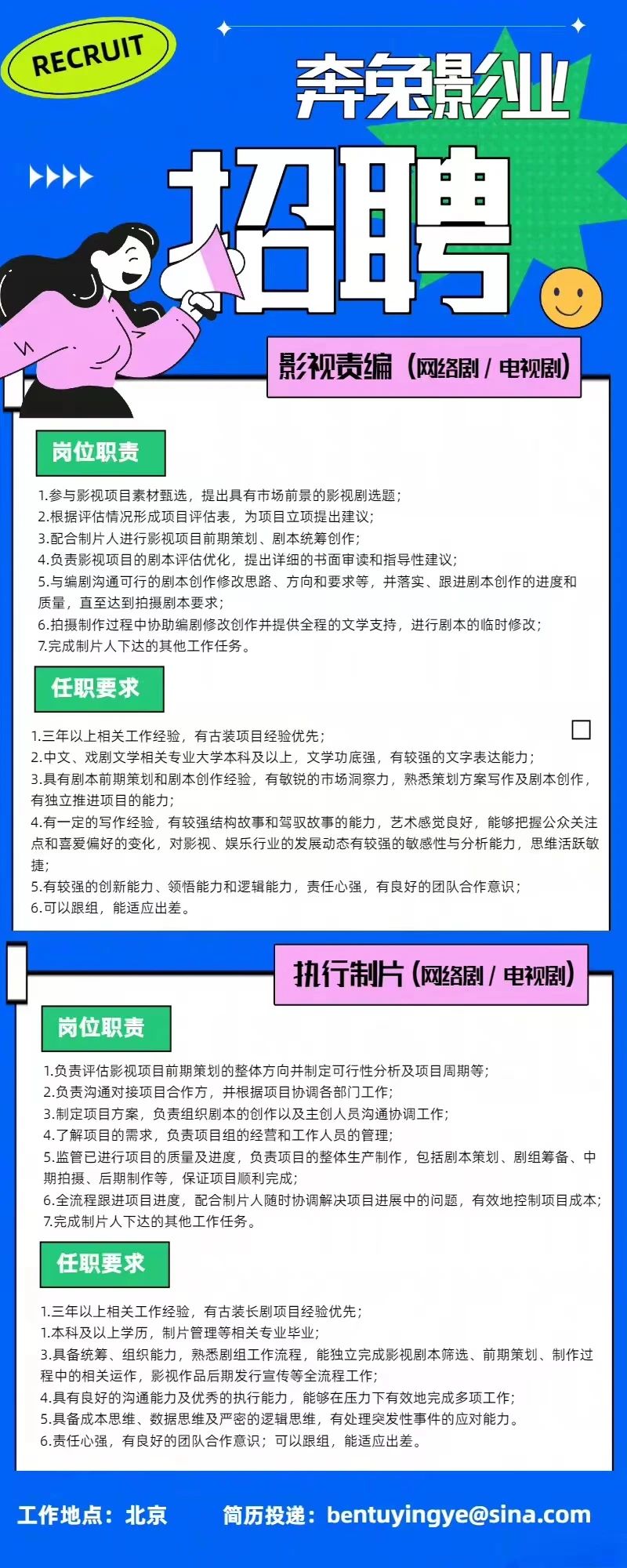 就业指导丨奔兔影业招聘影视责编、执行制片