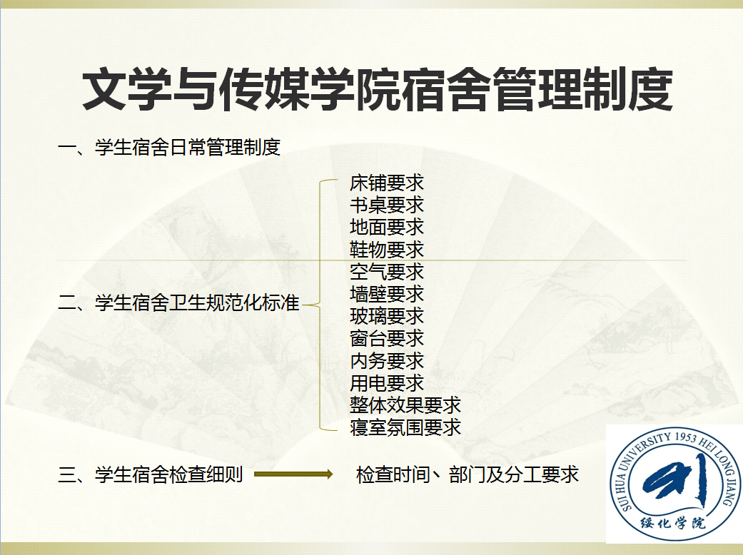 12.宿舍氛围要求:宿舍成员团结友好;宿舍间和睦相处;宿舍成员共同营造出一个温馨、和谐的休息学习环境;有本宿舍独特的宿舍文化;对待来客礼貌大方,热情接待。