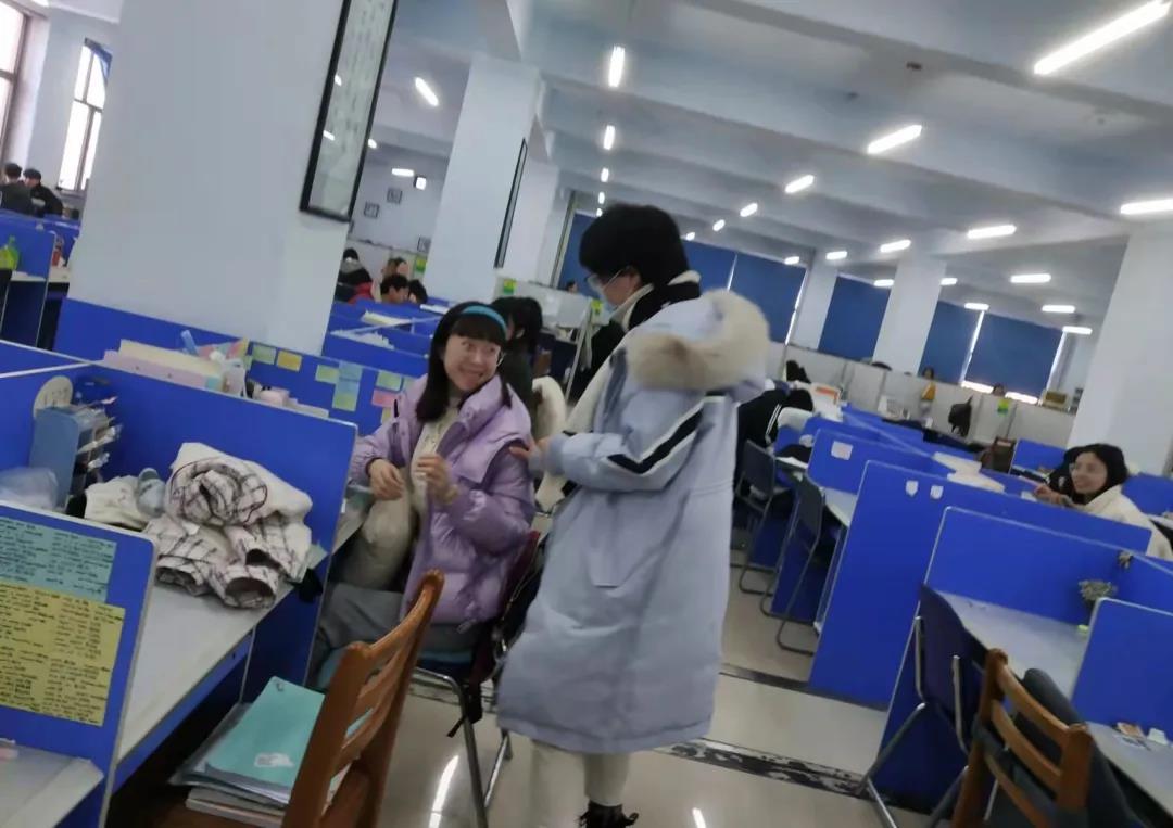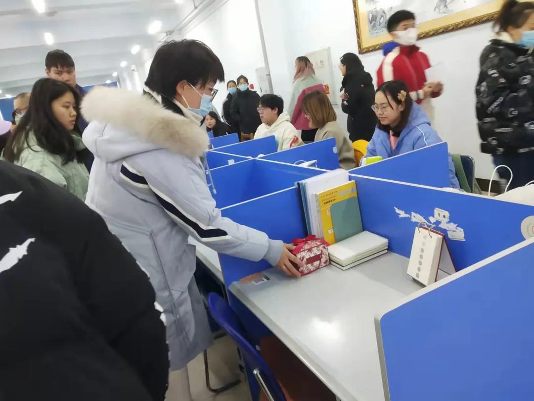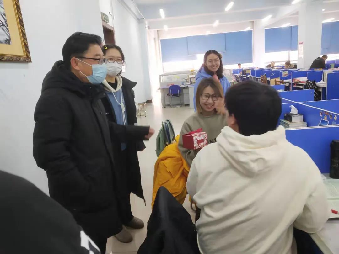 “孩子,准备的怎么样了?不要紧张,调整好心态,相信自己,你一定可以的!”“同学有没有信心考上自己心仪的学校呢?送你一个橙子,祝你心想事‘橙’,马到‘橙’功。”赵林楠、吴春生及全体辅导员走进学生中间,一边把带有祝福的橙子礼盒递给大家,一边关心备考学生心理状态和复习进展,并鼓励大家调整好心态,保持信心,迎接挑战。同时,鞠亚林还提醒同学们在最后冲刺时,也要关爱自己,合理安排饮食,注意作息时间,做好考前准备,并记得每日进行体温监测打卡,严格遵守学校考研期间疫情防控要求。