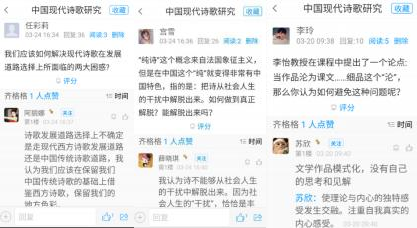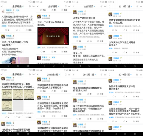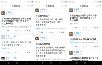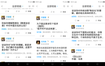 从讨论的实际进行情况看,2019级的孩子们讨论发言质量都不高,明显弱于18级的学生,这也可以理解,知识储备不足,学养不够,使他们无法真正有效地参与到话题讨论中,对此每次讨论总结老师都会讲解该如何驾驭这个题目,要想有效参与这个讨论该看一些什么书,应该是怎样的一种思路,随着时间的推移我想他们会慢慢成长。18级的讨论质量明显高于19级,讨论总结时老师会把学生的精华帖分享给大家。在讨论区除了老师可以发布讨论题目,我每节课都会动员学生把自己的疑惑或者想和大家交流的问题发布到讨论区中,大家一起参与。这方面也是18级做得好些,每节课都有学生在讨论区发布讨论题目,学生们的参与度也很高。