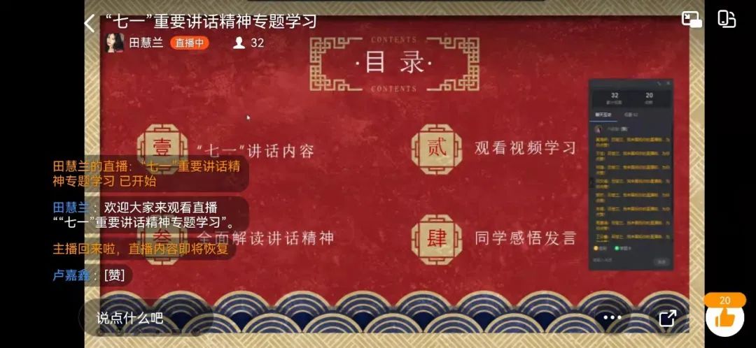 9月23日下午,万象城娱乐awc线路全体同学通过线上平台进行了学习贯彻习近平“七一”重要讲话专题学习会,各班级同学结合个人思想,以资交流、学习、借鉴。