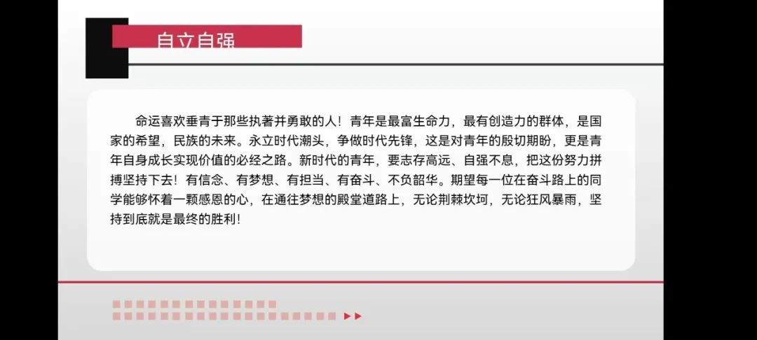 会上,各班负责人首先利用PPT、宣传视频等方式带领同学们认真学习了“励志、感恩、诚信”这几个词语的深刻内涵,并向同学们宣讲了我校贫困生资助和特殊困难学生就业帮扶的相关政策,为同学们介绍了近几年学校诚信、励志范例,并结合实际情况向同学们说明了励志的重要性。此次班会活动的开展表达了学校和学院在疫情闭环管理期间对同学们的关心和关爱。