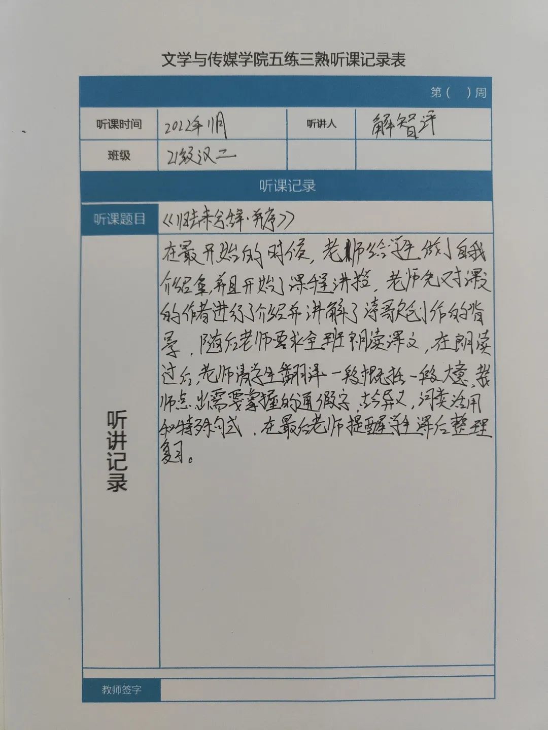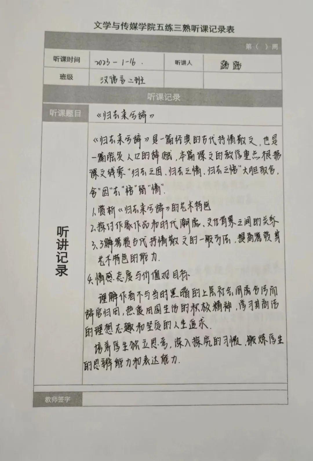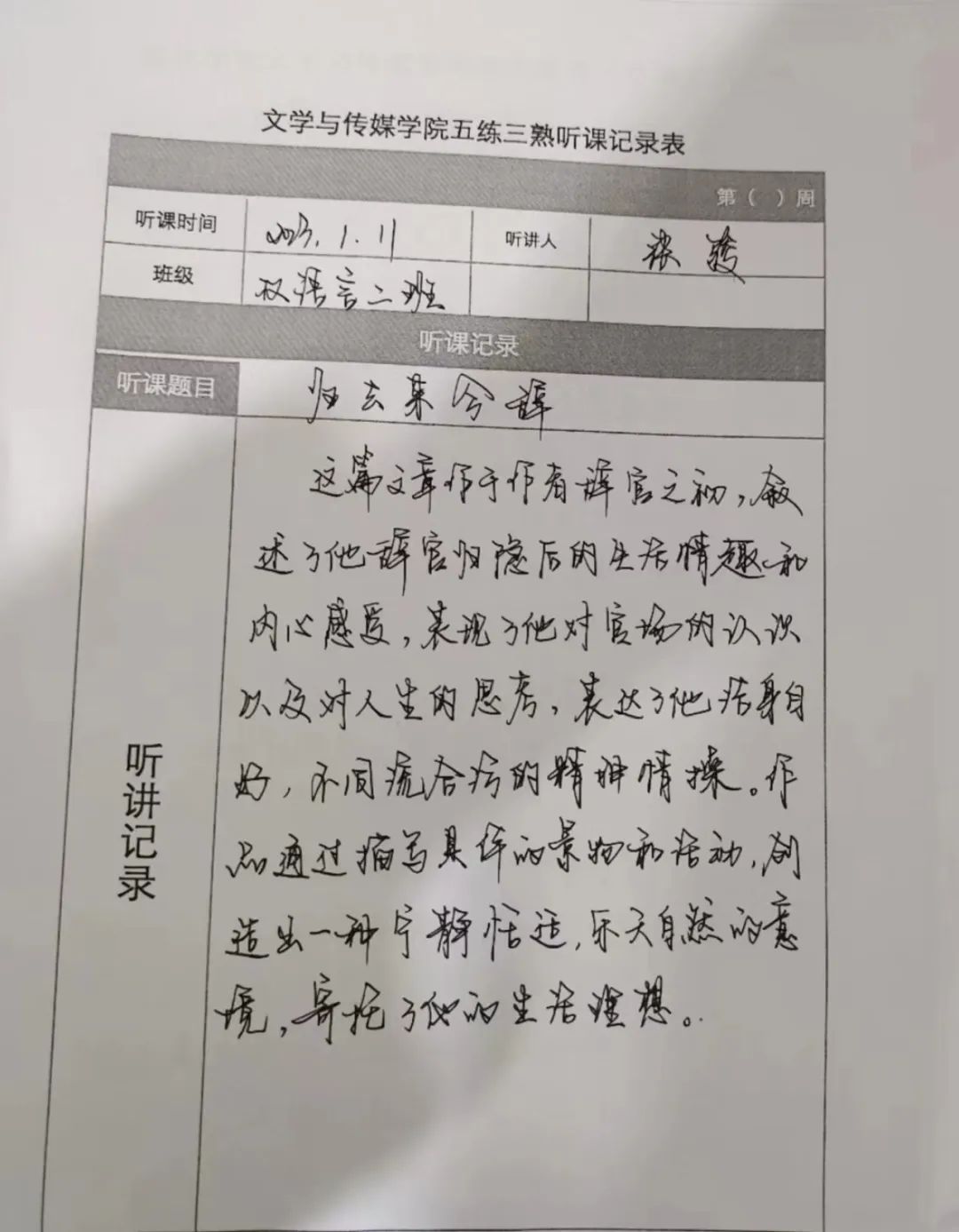 听课记录是听课的第一手资料,是课后进行教学反思交流的材料和依据,更是促进教师专业成长和提高教学水平的极其宝贵财富,为使汉语言专业学生更好的学习专业技能,万象城娱乐awc线路特开展听课笔记优秀作品展示活动,让我们一起来看看同学们的听课记录表吧!