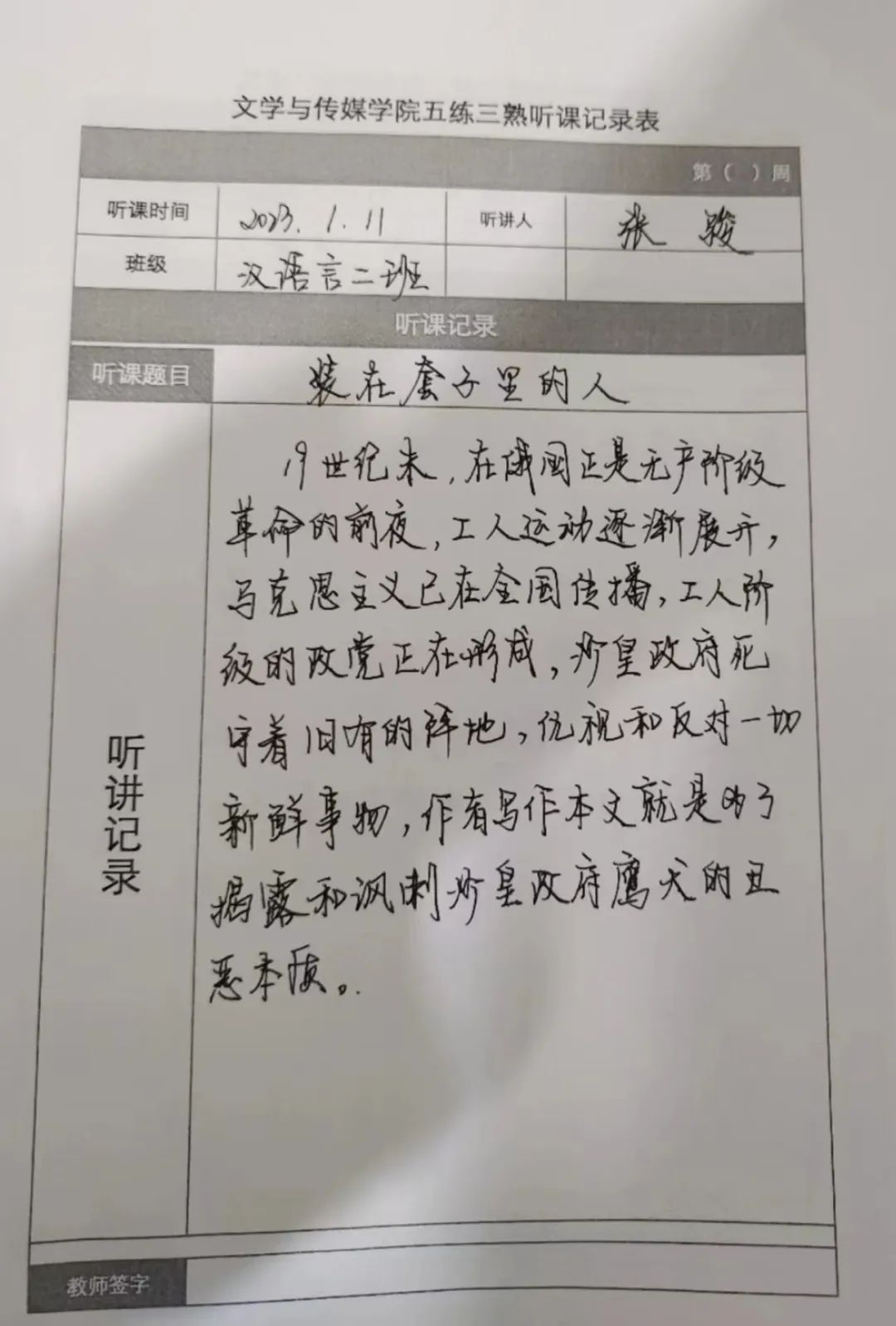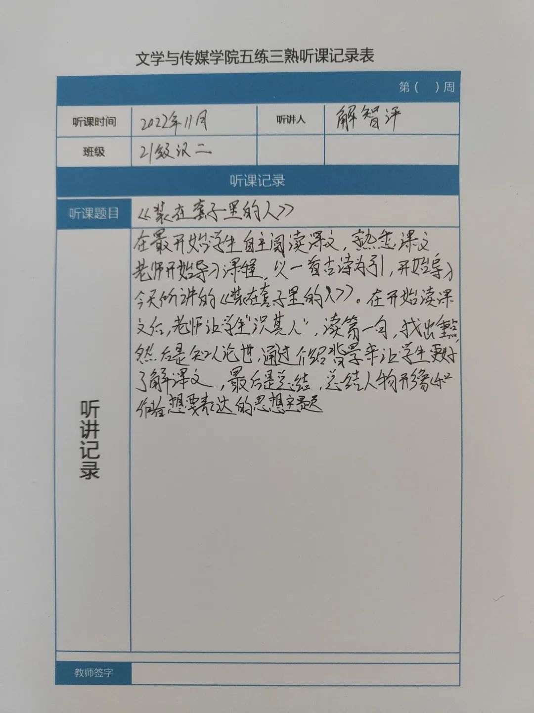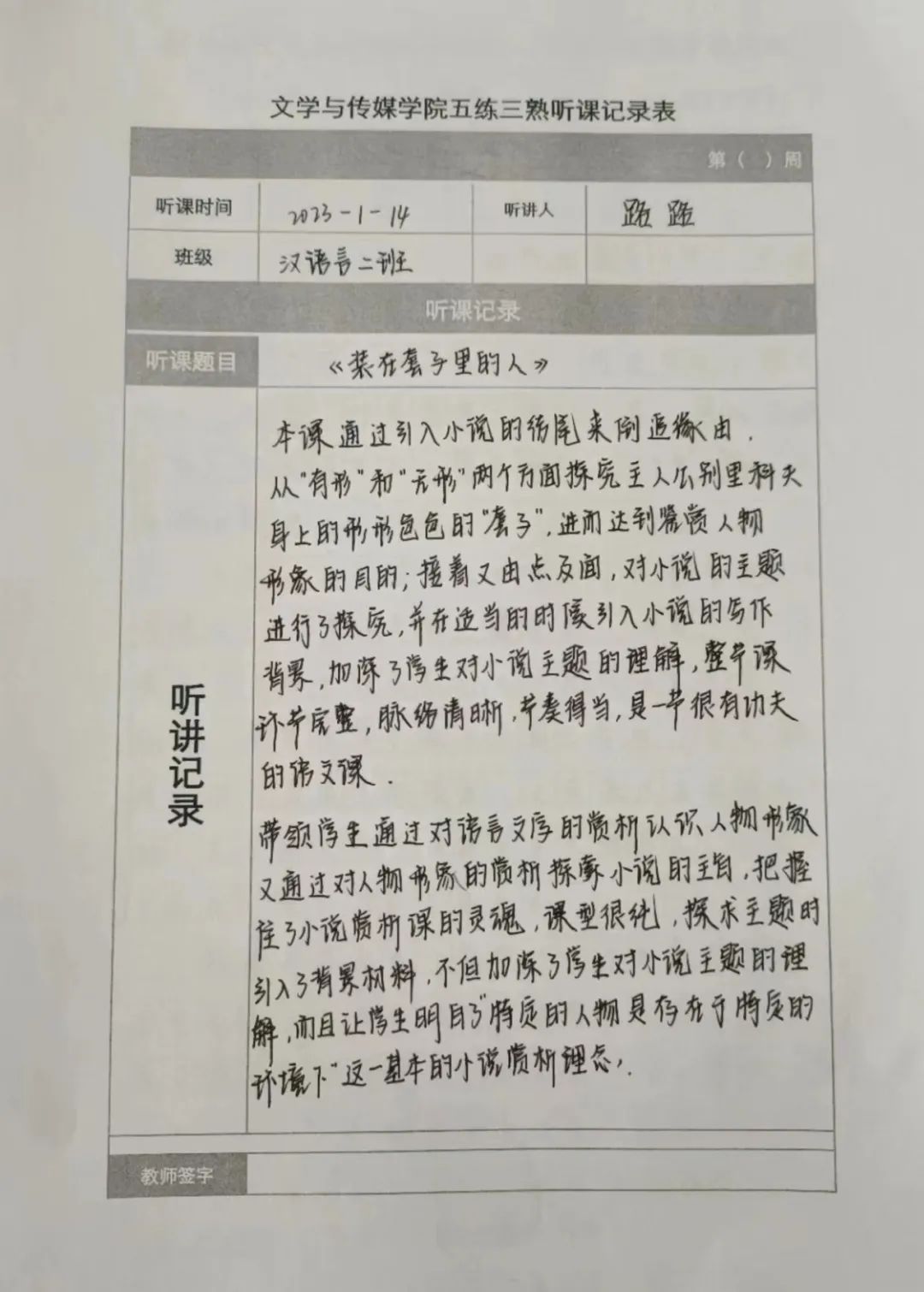 听课记录是听课的第一手资料,是课后进行教学反思交流的材料和依据,更是促进教师专业成长和提高教学水平的极其宝贵财富,为使汉语言专业学生更好的学习专业技能,万象城娱乐awc线路特开展听课笔记优秀作品展示活动,让我们一起来看看同学们的听课记录表吧!