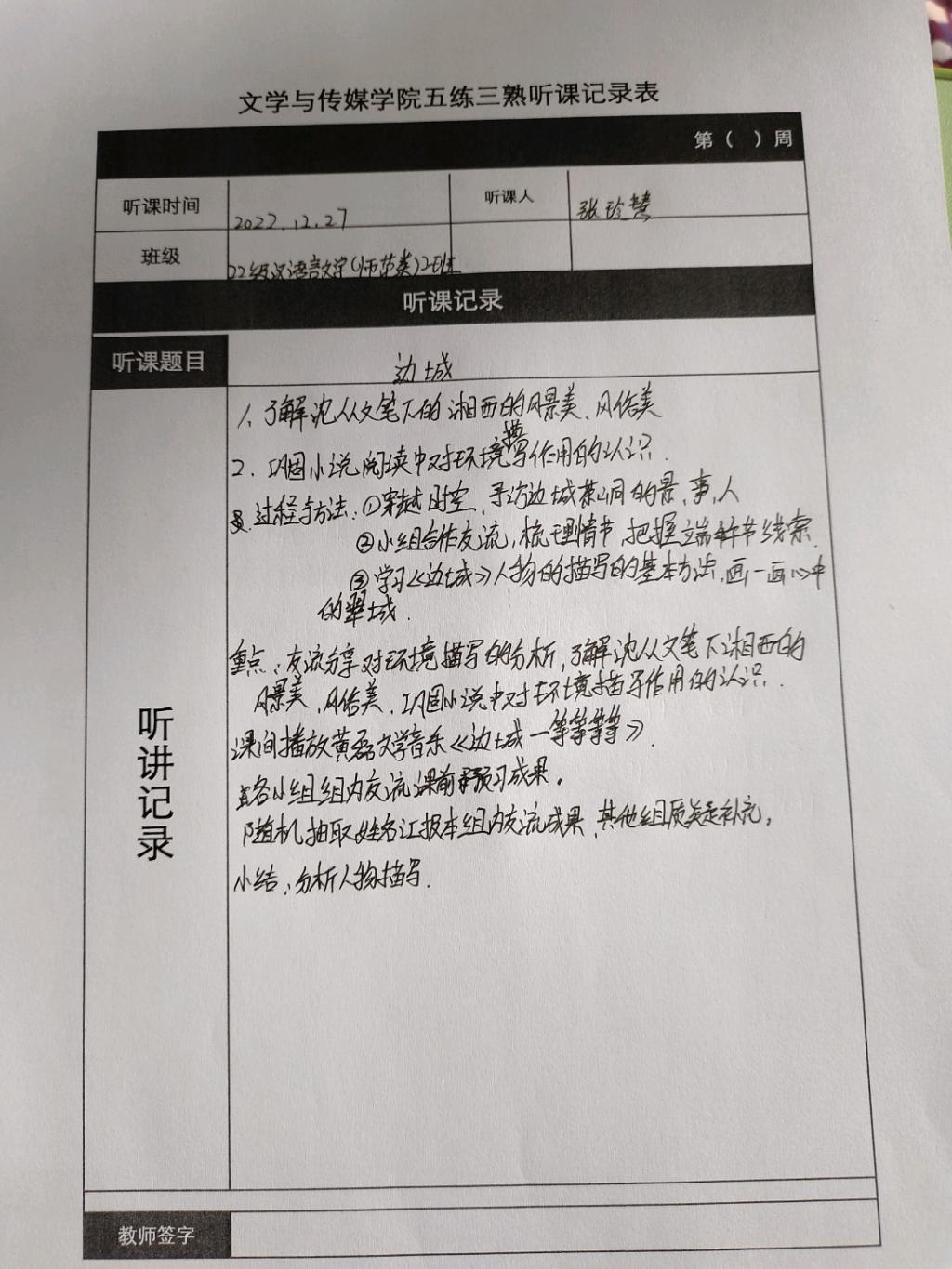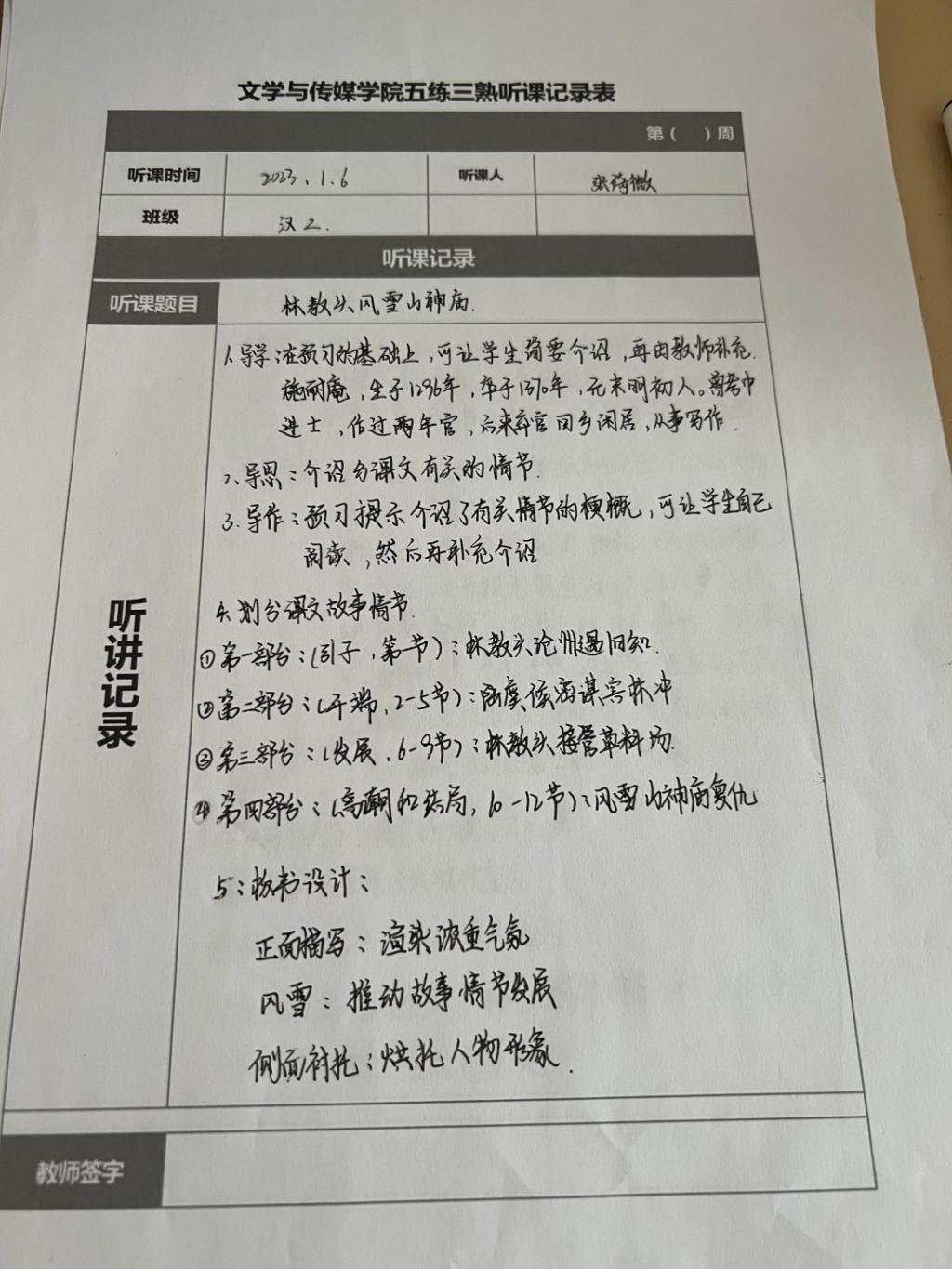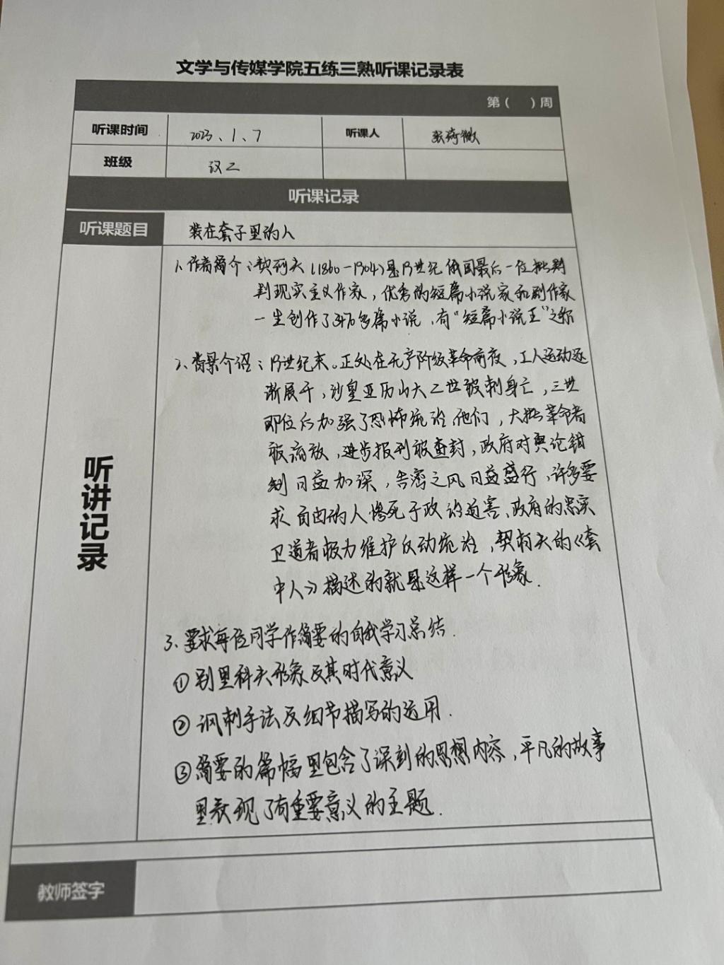 听课记录是听课的第一手资料,是课后进行教学反思交流的材料和依据,更是促进教师专业成长和提高教学水平的极其宝贵财富,为使汉语言专业学生更好的学习专业技能,万象城娱乐awc线路特开展听课笔记优秀作品展示活动,让我们一起来看看同学们的听课记录表吧!
