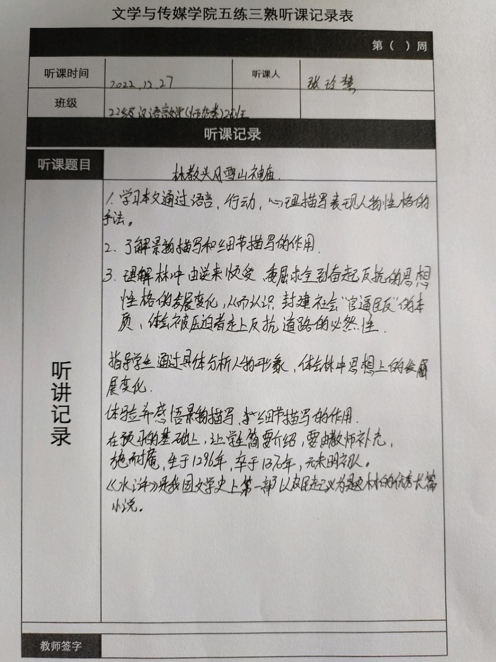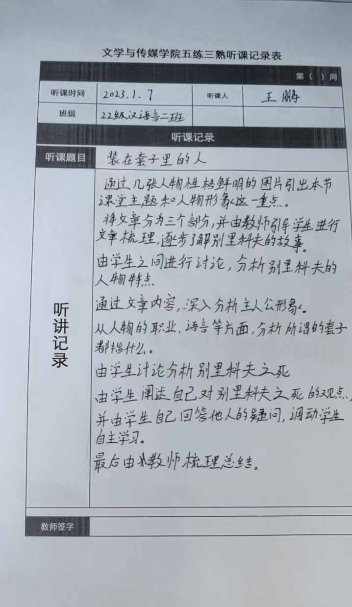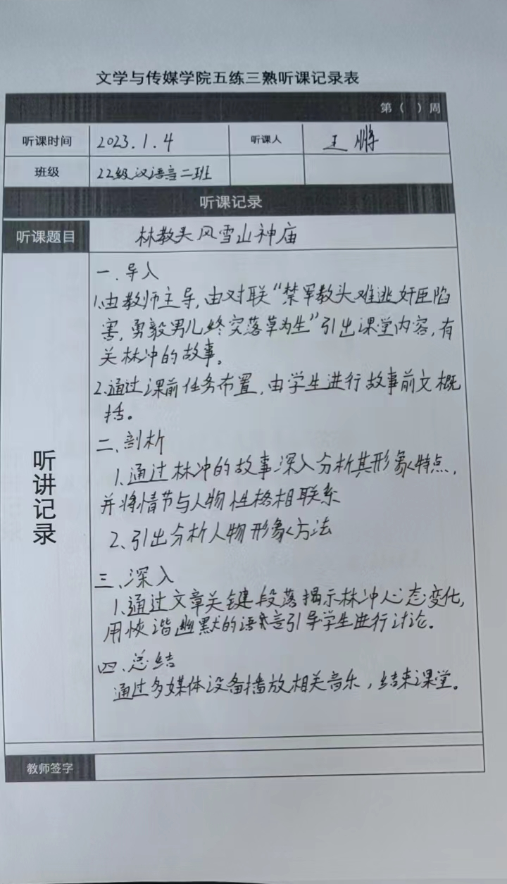 听课记录是听课的第一手资料,是课后进行教学反思交流的材料和依据,更是促进教师专业成长和提高教学水平的极其宝贵财富,为使汉语言专业学生更好的学习专业技能,万象城娱乐awc线路特开展听课笔记优秀作品展示活动,让我们一起来看看同学们的听课记录表吧!