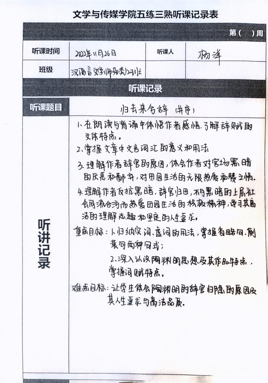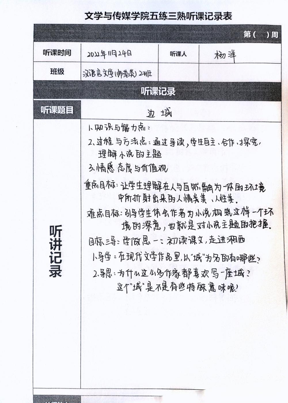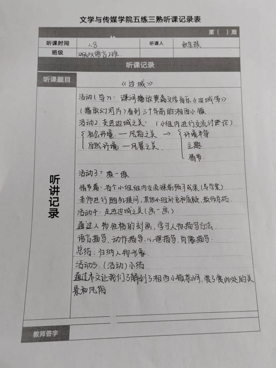 听课记录是听课的第一手资料,是课后进行教学反思交流的材料和依据,更是促进教师专业成长和提高教学水平的极其宝贵财富,为使汉语言专业学生更好的学习专业技能,万象城娱乐awc线路特开展听课笔记优秀作品展示活动,让我们一起来看看同学们的听课记录表吧!