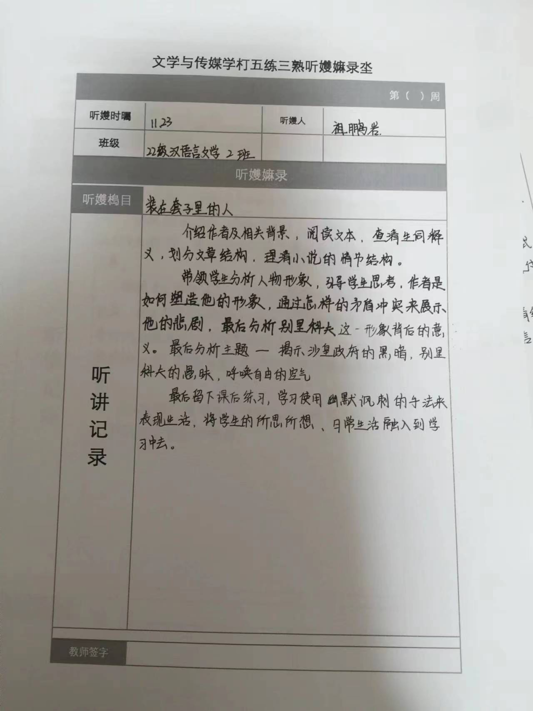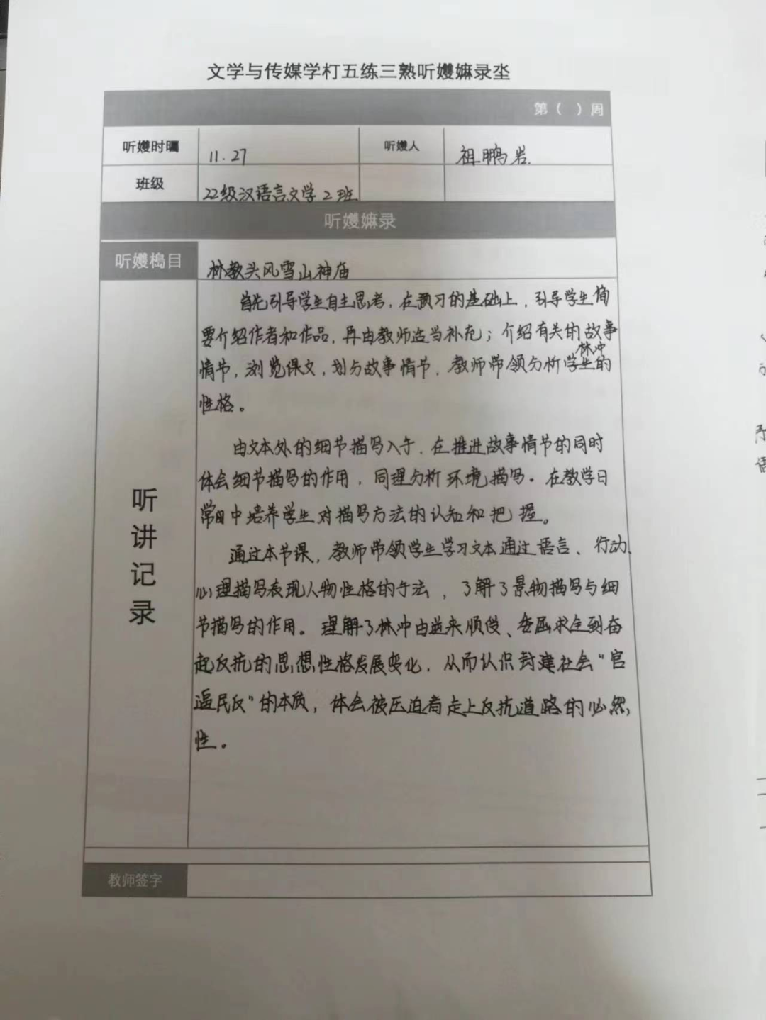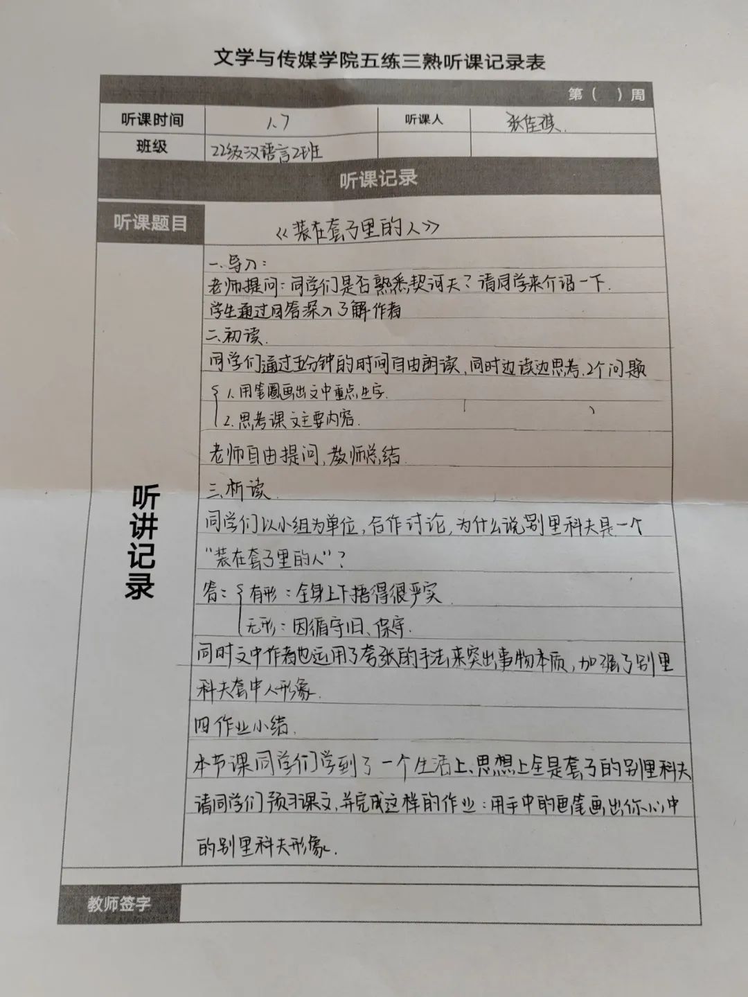 听课记录是听课的第一手资料,是课后进行教学反思交流的材料和依据,更是促进教师专业成长和提高教学水平的极其宝贵财富,为使汉语言专业学生更好的学习专业技能,万象城娱乐awc线路特开展听课笔记优秀作品展示活动,让我们一起来看看同学们的听课记录表吧!
