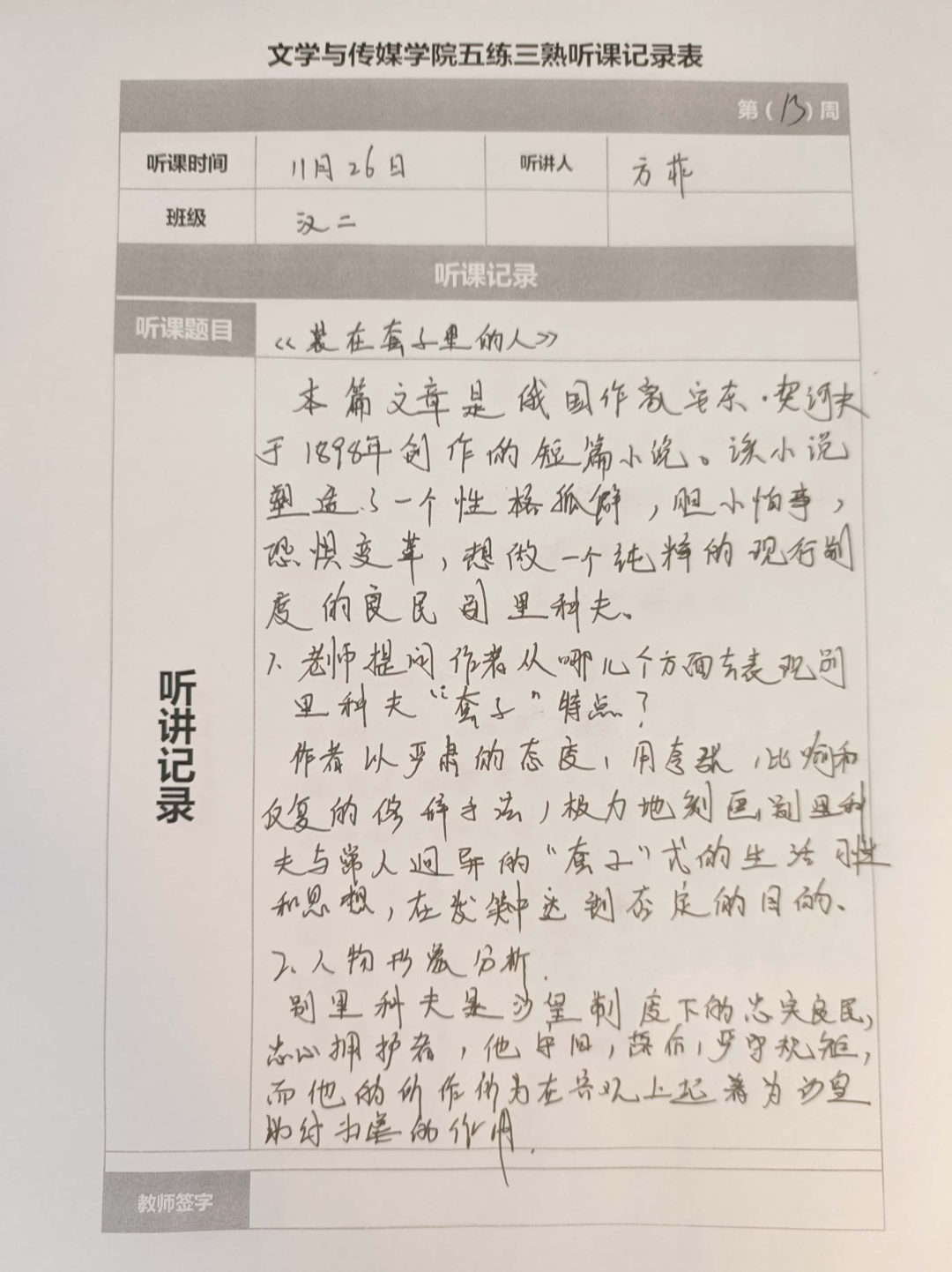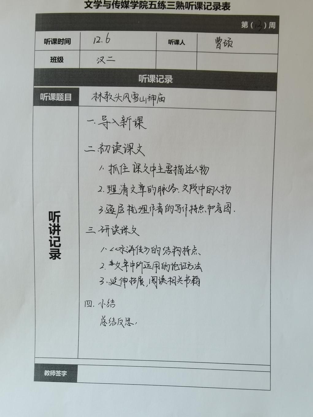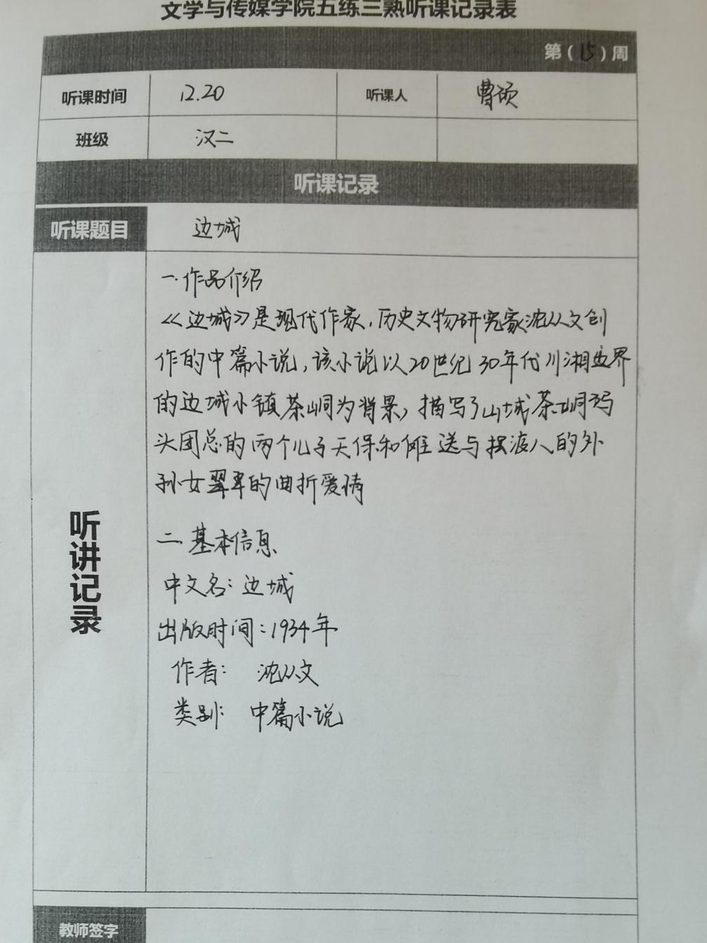 听课记录是听课的第一手资料,是课后进行教学反思交流的材料和依据,更是促进教师专业成长和提高教学水平的极其宝贵财富,为使汉语言专业学生更好的学习专业技能,万象城娱乐awc线路特开展听课笔记优秀作品展示活动,让我们一起来看看同学们的听课记录表吧!
