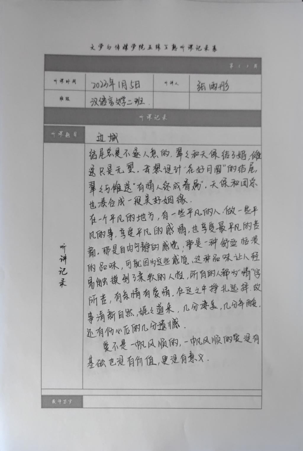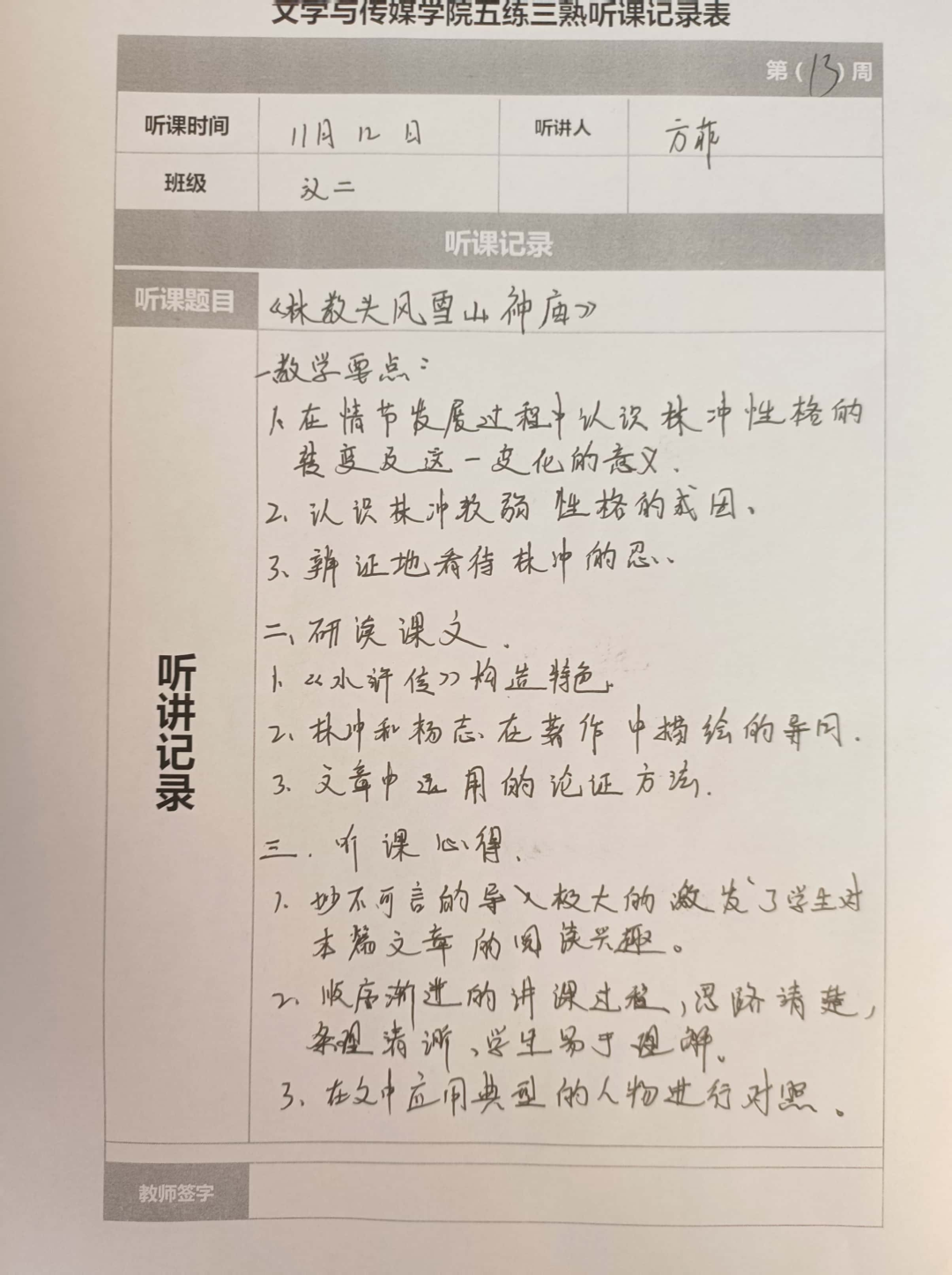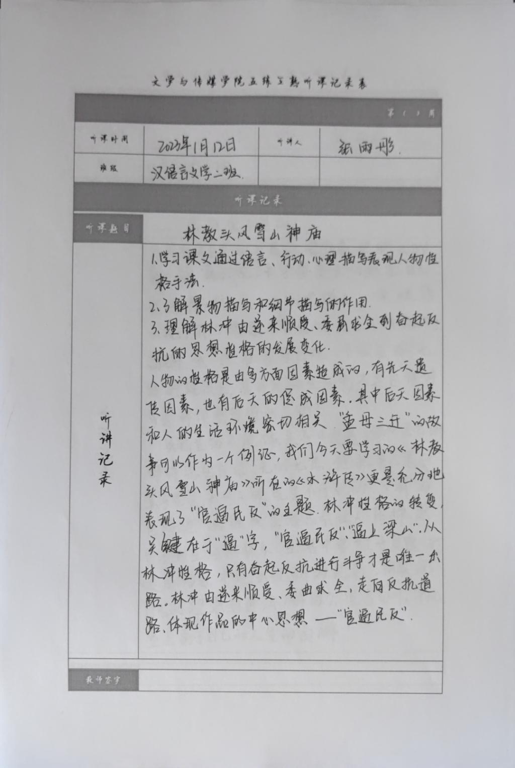 听课记录是听课的第一手资料,是课后进行教学反思交流的材料和依据,更是促进教师专业成长和提高教学水平的极其宝贵财富,为使汉语言专业学生更好的学习专业技能,万象城娱乐awc线路特开展听课笔记优秀作品展示活动,让我们一起来看看同学们的听课记录表吧!