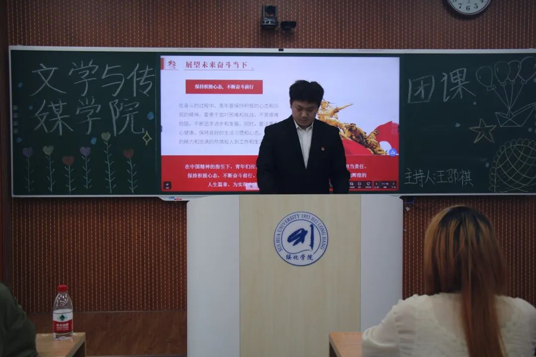 在团课中,主讲人王邵祺与同学们探讨了何为中国精神,之后向大家讲解了中国精神的具体内容和一百年来无数青年奋斗着,在国家危难之际、人民需要之时挺身而出写下的对中国精神的答卷。借用习近平总书记说过的:“国家的希望在青年,国家的命运在青年。新时代的中国青年要担当时代责任。”证实了青年人是实现民族复兴、国家富强的攻坚力量,向入团积极分子们传递了作为青年一代,同学们应躬身入局,有担当、有抱负、有理想,用奋斗的青春谱写新的中国篇章,以青春的轨迹划出时代昂扬向上的曲线,为祖国的发展而不懈耕耘的心得体会。