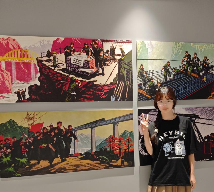 在此次活动中,胥丹同学首先参观了时光隧道,隧道两侧的“乡村振兴二十字方针”,在灯光的照耀下,带领她开启了这次3536三线城之旅。接着她参观了红飘带游客中心地块,在三线记忆光影馆中通过声、光、电高科技元素,她了解到了上个世纪60年代那段火红的岁月,同时在这里她参观了军装展览馆,认识到该厂作为上个世纪重要的军装生产厂的重要地位。随后她到达了三线建设博物馆,在这里她见证了三线建设的艰苦历程以及射洪人民为了三线建设做出的极大努力。