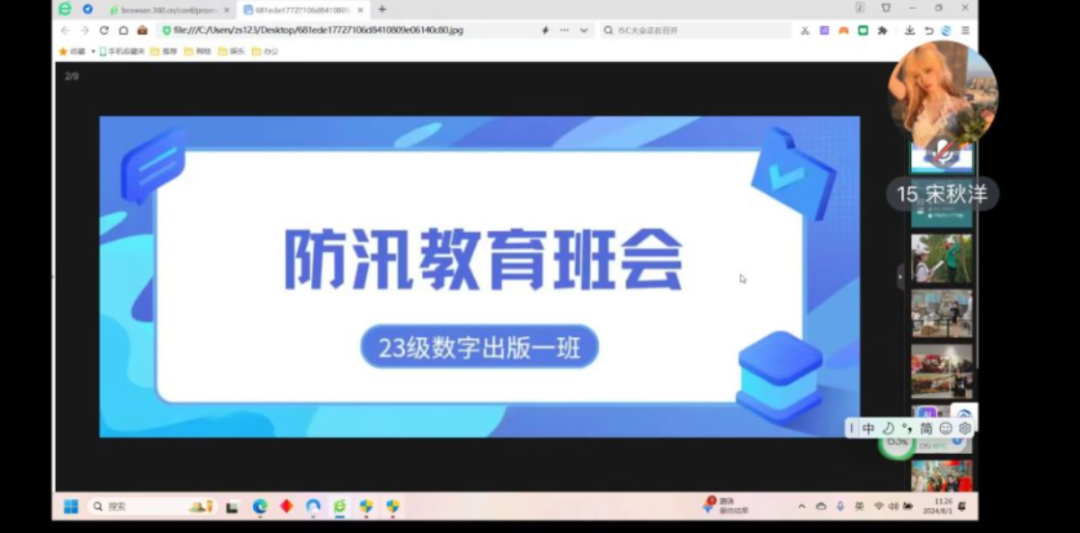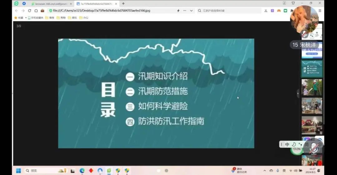 近期强降雨或连续性降雨等恶劣天气频繁发生,容易引发洪涝、泥石流、滑坡,大风等自然灾害的发生。为了预防和杜绝安全事故发生,进一步增强防汛意识,切实保障生命安全,确保广大学生安全、愉快地度过暑假,由辅导员于小庆带队,采用线上的方式,万象城娱乐awc线路各班就开展学生防汛教育与提示工作召开班会。
