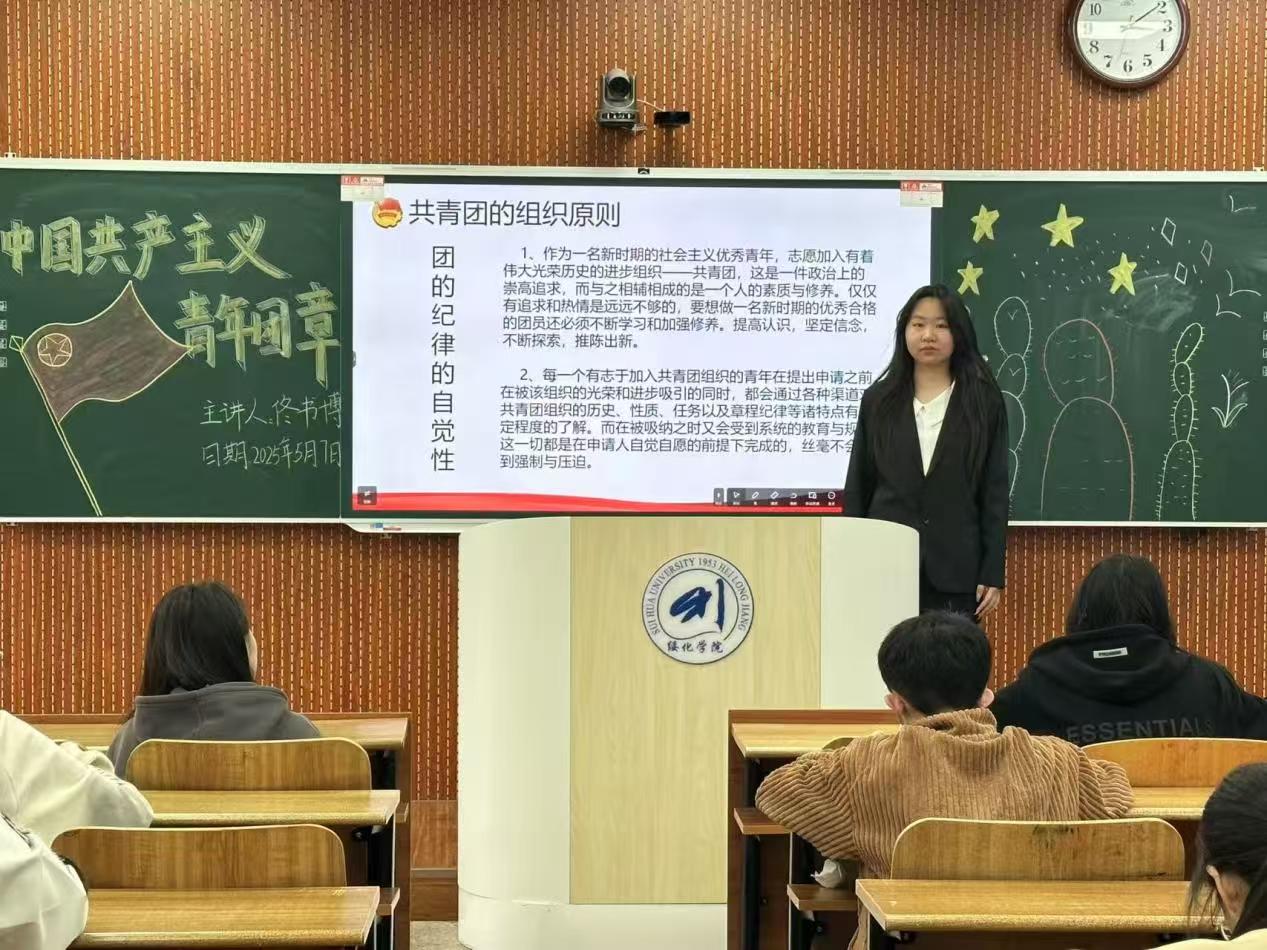 团课伊始,佟书博从团章的重要地位切入,指出团章是共青团组织的纲领性文件,承载着共青团的初心与使命。随后,她围绕团章核心内容展开讲解,阐述了共青团作为党的助手和后备军的政治定位,系统剖析团员发展流程、组织纪律要求,并着重强调新时代青年团员应如何将团章要求融入日常学习与生活。同时,结合团章中对青年使命的论述,他号召同学们坚定理想信念,在专业学习、社会实践中锤炼本领,以实际行动践行“请党放心,强国有我”的青春誓言。