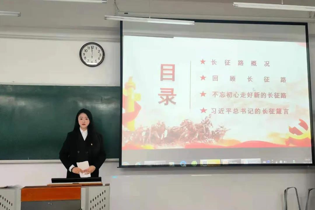 高涵同学首先介绍了长征之路的背景,与同学们一起回顾了长征路上的重大事件,分享了关于走好新长征的心得感受,高涵同学重点介绍了习近平总书记关于长征精神的总结。让同学们感受到了不怕牺牲、敢于拼搏的无产阶级革命精神以及顾全大局、严守纪律的高尚品德,深刻领悟了长征精神的伟大。随后,杜阳同学讲述了瞿秋白烈士的故事,让同学们深刻学习到了共产党人严于律己、勇担重任的伟大精神。