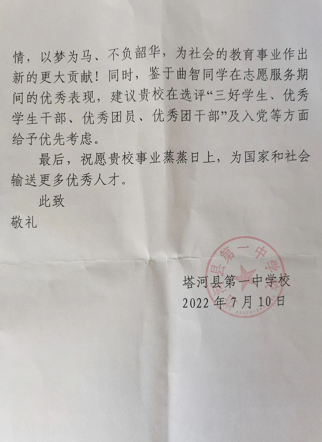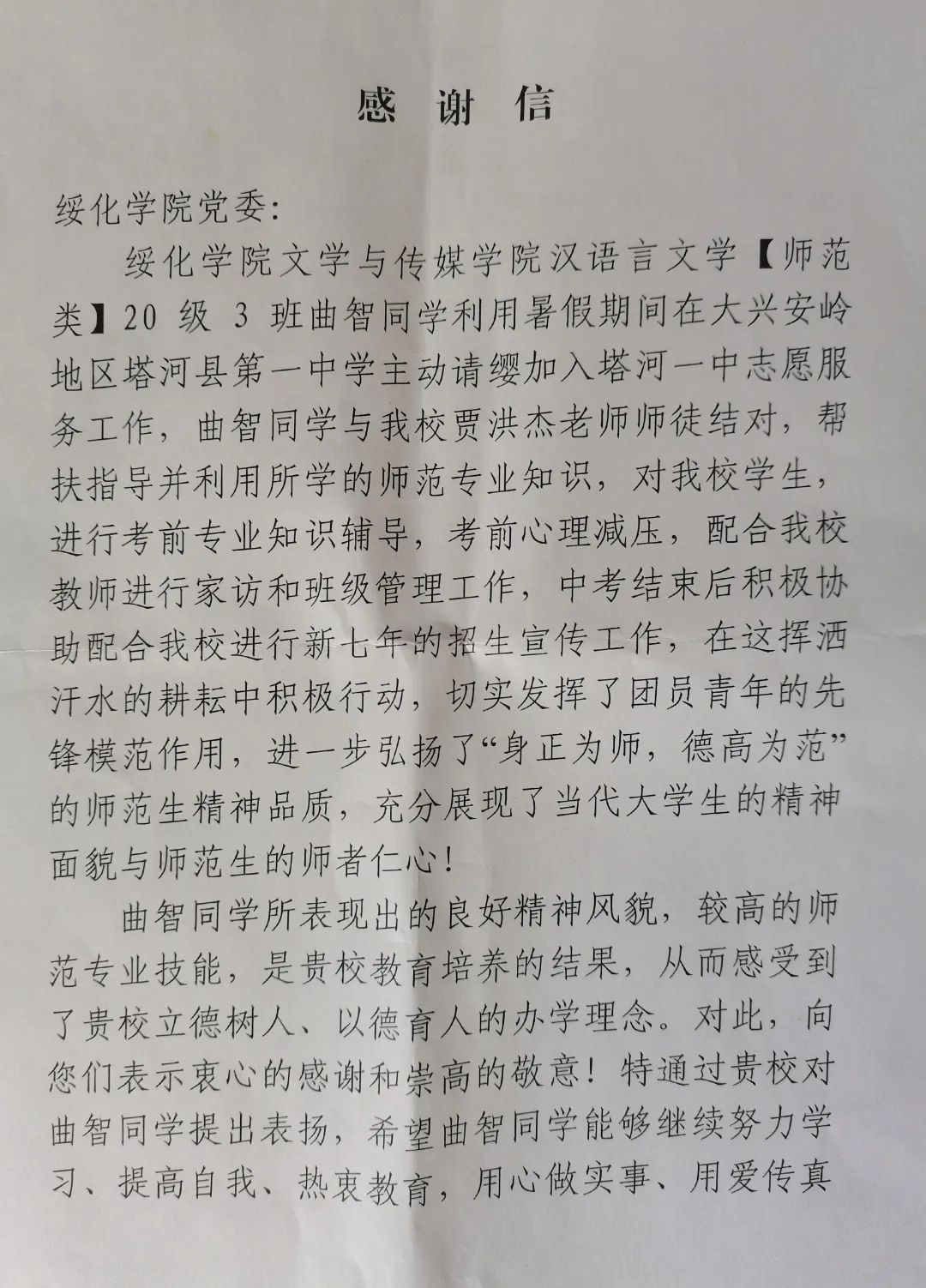 7月10日,万象城官网收到一封来自塔河县第一中学的感谢信。信中对我校万象城娱乐awc线路2020级汉语言文学专业三班学生曲智同学主动请缨为塔河一中学生提供考前辅导、缓解心理压力等志愿服务活动予以了高度的肯定和赞扬,对我校在培养学生精神风貌、道德素养、师范精神等方面所做的教育工作表示由衷的感谢。
