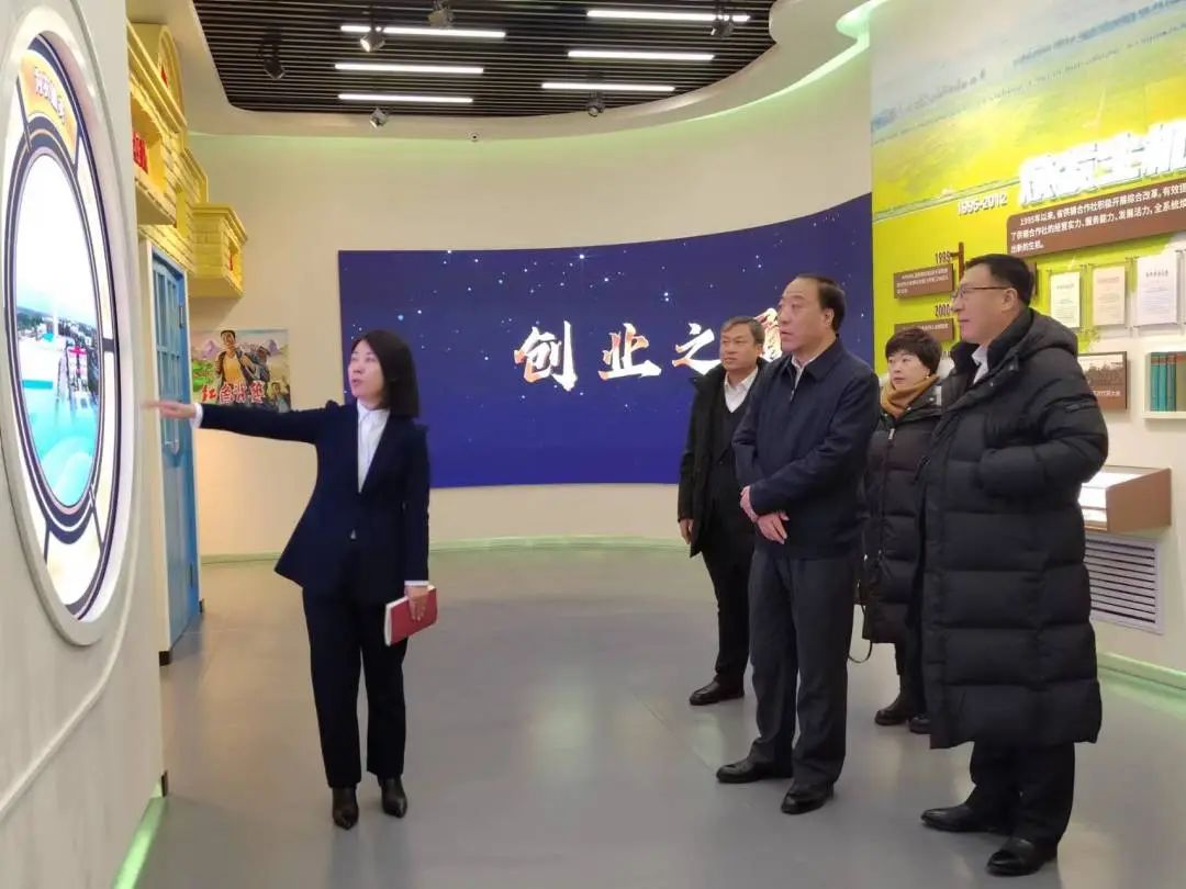 刘峰一行首先参观了以“弘扬龙江供销历史文化,书写龙江供销崭新篇章”为主题的黑龙江省供销合作社历史文化馆,深入了解了省供销合作社的基本概况、社有企业、组织体系、为农服务、党建引领、荣誉成绩,观看了讲述黑龙江省供销合作社发展历程的专题片《奋进》。随后,参观了供销社小康龙江直播共享基地、黑土优品品牌展馆和选品体验中心,黑龙江省小康龙江集团有限公司副总经理卞雪双详细讲解了公司在大力推动数字赋能品牌农业方面所采取的一系列举措。