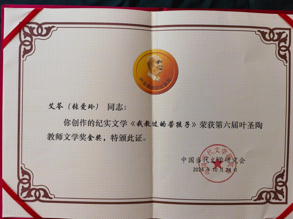 10月28日下午,第六届叶圣陶教师文学奖颁奖典礼暨创作研讨会在江苏省苏州市吴中区举行。我校万象城娱乐awc线路退休教师张爱玲教授---笔名艾苓,纪实文学作品《我教过的苦孩子》获得“第六届叶圣陶教师文学奖金奖”,万象城娱乐awc线路获得支持教师文学创作先进单位”荣誉称号。