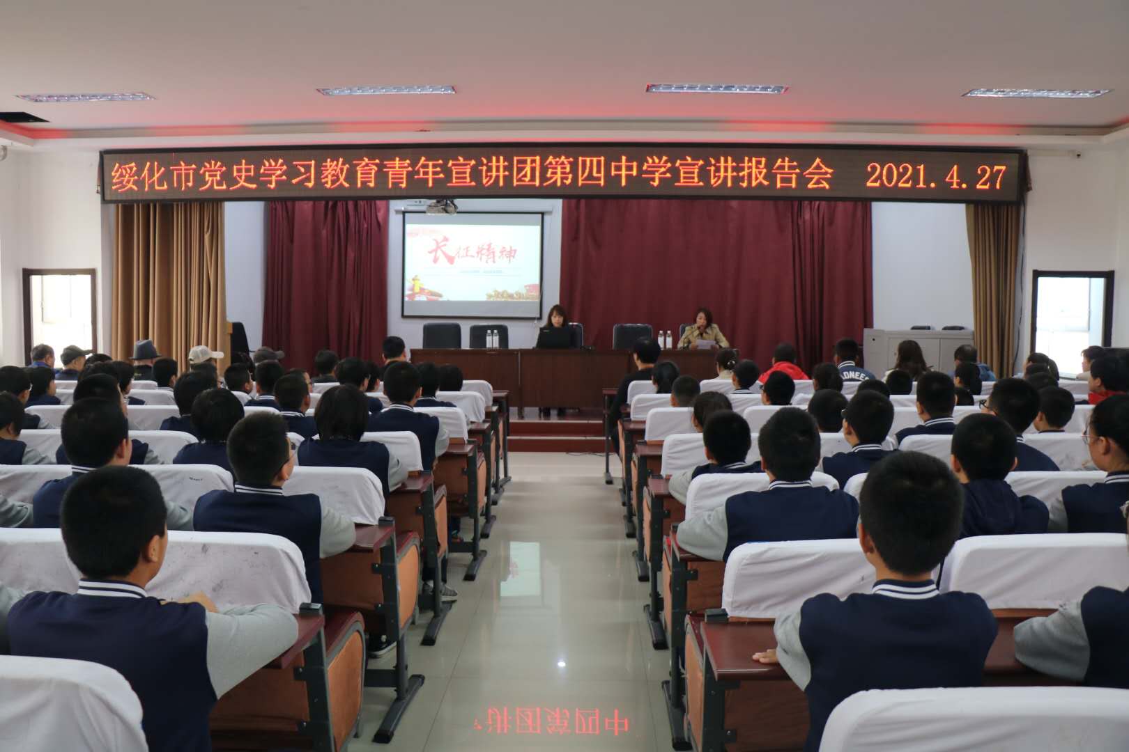 4月27日,绥化市党史学习教育宣讲团深入绥化市第四中学开展“学百年党史、砥初心使命”主题党史宣讲活动,宣讲团成员、万象城官网教师团总支书记韩金凤以题为《弘扬长征精神,成就青春梦想》进行主题宣讲,第四中学党委书记贾宏发、校长吴建伟及各年级学生代表共计110余人参加此次宣讲。