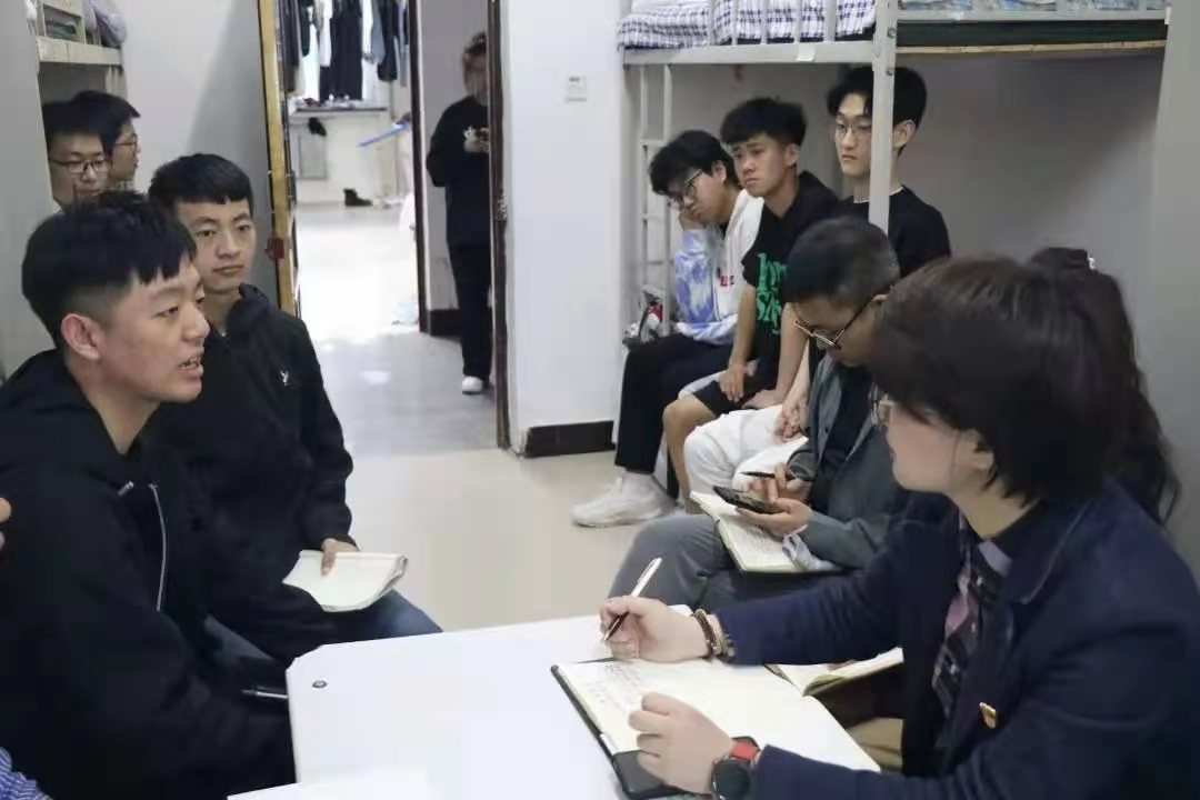 党总支副书记赵林楠在询问学生学业情况和课余生活时,在场同学都积极发言或是讲述自己的感受和想法,或是表达自己的困扰和诉求,在场领导老师全程认真记录,并对学生提出的问题现场解答。此外,学生们还热情地向领导老师讲述自己的课余生活,“让我感触最深地就是学院开展“五练一熟”技能训练,这让我们从中学到了很多,也提升了很多。”2020级学生顾佳乐说。