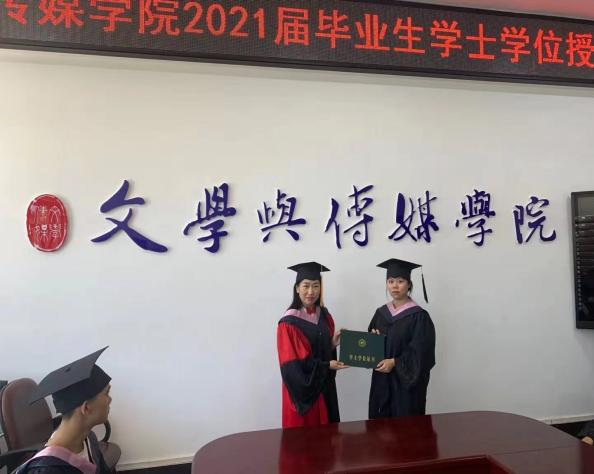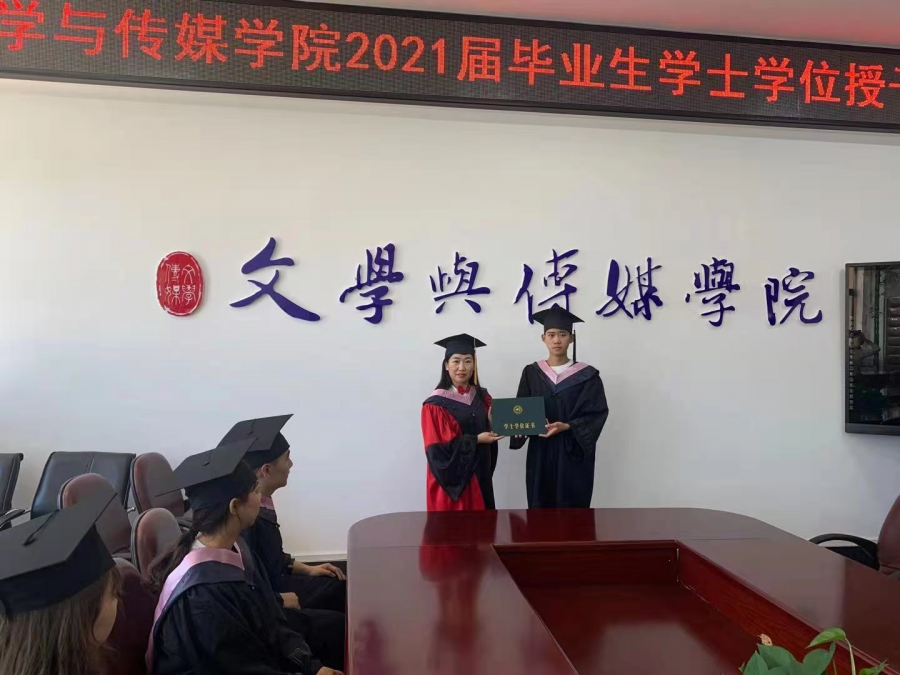 6月20日下午,万象城娱乐awc线路2021届毕业典礼暨学士学位授予仪式在汇文楼324会议室举行。万象城官网院长高岩为毕业学子颁发学士学位证书。