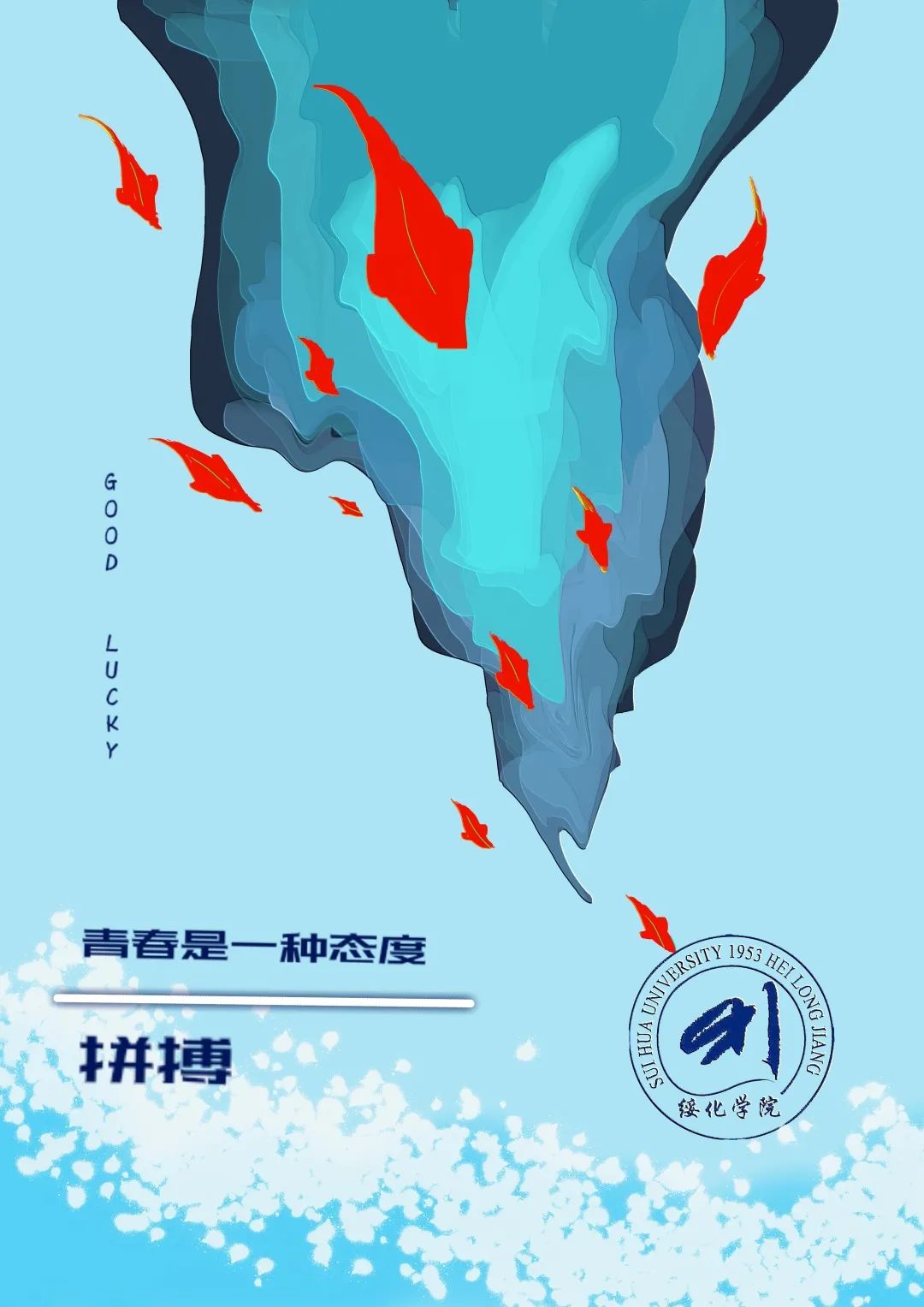 今天展播新媒体海报设计二等奖经济管理学院市场营销专业王宇婷的作品:《青春与绥大》