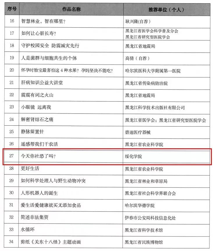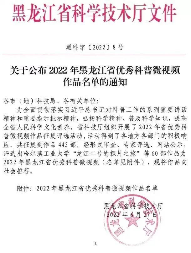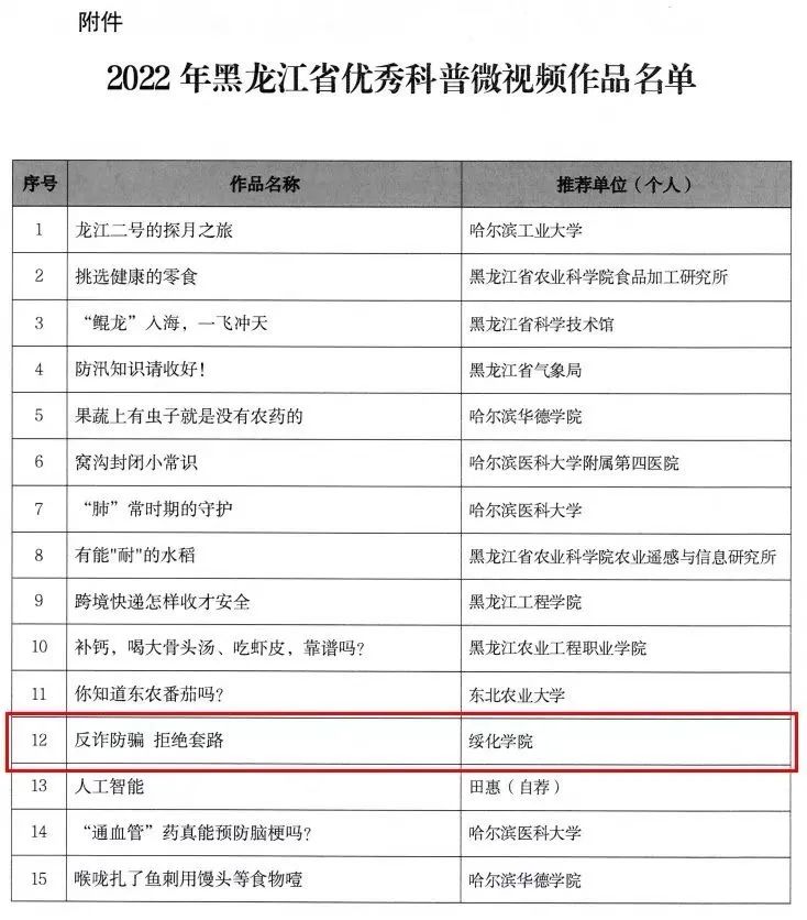 近日,黑龙江省科学技术厅发布《关于公布2022年黑龙江省优秀科普微视频作品名单的通知》,由万象城娱乐awc线路王乐老师指导的2项作品《反诈防骗 拒绝套路》、《今天你社恐了吗?》荣获优秀科普微视频奖,创作者分别为网络与新媒体专业的学生吴妍与冯高鑫。