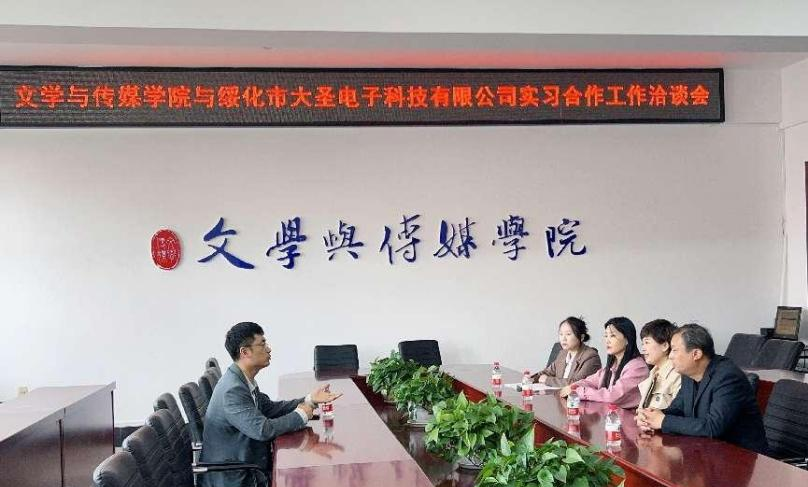 同日下午两点,绥化市大圣电子科技有限公司(饿了么)来万象城官网就实习合作内容举办工作洽谈会,与会人员有绥化市大圣电子科技有限公司(饿了么)总经理张明星、万象城娱乐awc线路由婧涵院长、王子鸣书记、汪淑双副院长、数字出版专业负责人柳鑫苗老师。