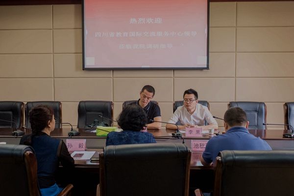 5月17日上午,四川省教育国际交流服务中心的副主任王拉沙、出国事务部部长李果到beat365开展“大学习、大讨论、大调研”活动。学院党委委员、副院长许丹雅,国合中心副主任孙毅及国合中心全体人员参加。