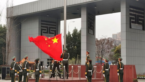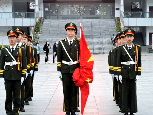 早上八点整,迎着朝阳,升旗仪式正式开始。全场一片肃静,学院国旗护卫队成员迈着坚定的步伐护送国旗来到国旗台下,在激昂的《义勇军进行曲》中,升旗手振臂一挥,鲜艳的五星红旗在晨曦的照耀下徐徐展开,在全体师生的注目中缓缓升起,飘扬在学院的上空。