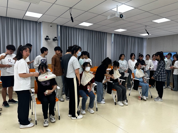 急救培训旨在进一步加强大学生的生命安全教育,了解急救的意义和重要性,广泛普及急救知识和急救技能,提高学生自救互救能力。此次培训以理论讲授、现场交流、模拟演练、技能考核等多种方式进行。在为期2天的培训中,同学们学习了现场救护的原则、了解掌握了伤口止血、伤口包扎、骨折固定等急救必需环节。培训教师现场讲授心肺复苏术、AED使用方法等理论知识,充分强调了现场急救的重要性。在实操演练环节,培训教师进行心肺复苏、伤口包扎固定的现场示范,并指导学生进行实操演练。在一次次的反复练习后,同学们都能熟练地掌握心肺复苏术的流程及操作要领,并顺利通过救护员考核。活动现场气氛活跃,学习氛围浓厚,同学们积极提问交流,亲身体验心肺复苏术、伤口包扎固定的基本操作。