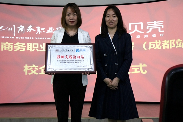 5月13日上午10点,学院与成都市房地产经纪协会、四川贝壳闹海房地产经纪有限公司举行合作授牌仪式。成都市房地产协会培训部负责人马景卫,四川贝壳闹海房地产经纪有限公司政府和公共事务中心负责人孙堃,人力支持团队总监郭花,人力支持团队校招经理任倩,校招主管胡城瑜、潘思忆,学院副院长康璐,学院党委委员、经济贸易系主任朱贵水,团总支书记庞莹莹及师生代表出席。仪式由经济贸易系副主任李静主持。