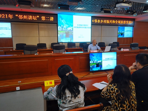 5月20日下午,学院2021年定点帮扶培训项目——“邻水乡村振兴和全域旅游发展”专题培训在邻水县宣传文化中心五楼会议室举办,来自邻水县文化和旅游产业成员单位、各镇、重点旅游企业130余名学员参加培训,邻水县文广旅局局长谭钦超主持培训会,学院派驻磬明村第一书记黄进担任培训教师。