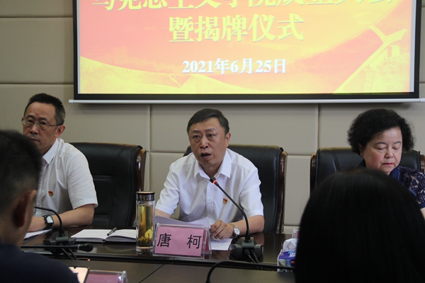 唐柯代表学院对马克思主义学院的成立表示热烈祝贺,并强调,成立马克思主义学院,是学院思想政治教育工作中的一件大事,是坚持习近平新时代中国特色社会主义思想为指导,贯彻落实全国高校思想政治工作会议精神和中央、省委关于加强高校党建工作和意识形态工作的重要举措,对于加快推进马克思主义学科建设和发展,加强意识形态工作和宣传思想阵地建设,加强大学生思想政治教育,都具有十分重要的意义。他就其未来的建设和发展,提出四点意见:一是提高政治站位,始终坚持政治立院;二是注重守正创新,始终坚持质量建院;三是提升教师素质,始终坚持队伍强院;四是对标先进典型,始终坚持品牌兴院。
