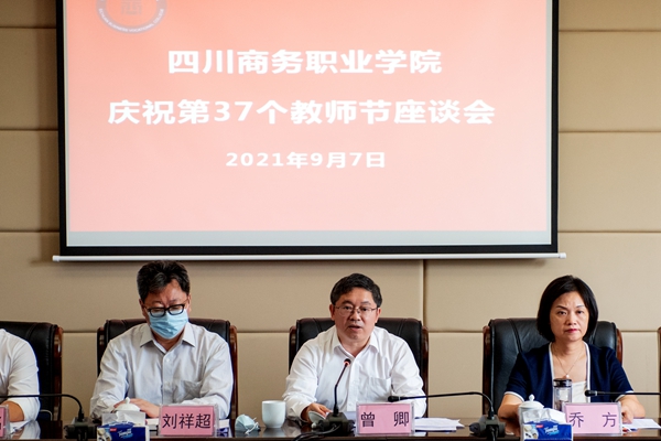 为庆祝第37个教师节,9月7日上午,学院在和盛校区召开以“赓续百年初心 担当育人使命”为主题的教师节座谈会。会议由学院党委书记唐柯主持。商务厅党组书记、厅长曾卿出席座谈会并作重要讲话。