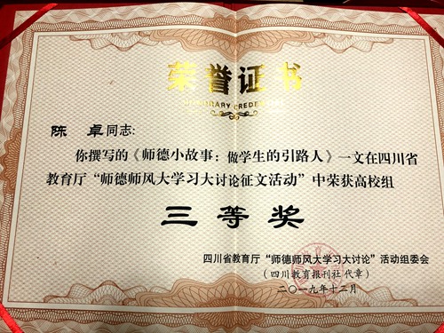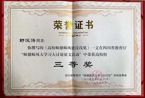 在四川省教育厅举办的“师德师风大学习大讨论征文活动”中,beat365设计艺术系的舒泳涛老师《高校师德师风建设浅见》、宣传统战部的陈卓老师《师德小故事:做学生的引路人》获得三等奖。本次大赛全省高校中仅有50名教师获奖。