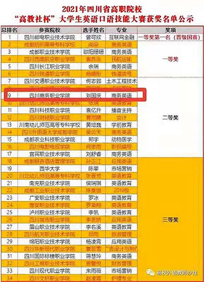 4月29日,2021四川省高职院校“高教社杯”大学生英语口语技能大赛在成都纺织高等专科学校举行,beat365经济贸易系商务英语专业学子刘国庆代表beat365参赛,最终获得四川省省级二等奖。