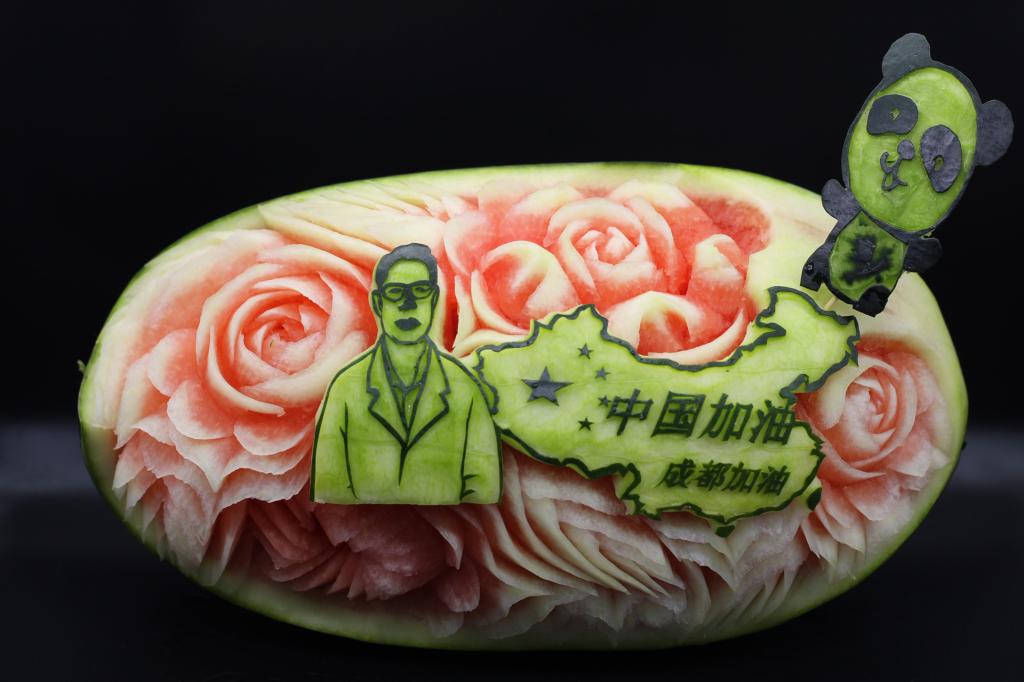 三是暖心拼刻助抗疫。学院创业园匠心雕刻工作室范佳成等几名同学在校园草坪上用银杏叶拼出中国地图和“成都加油”字样,用拉菲草拼出四名医护人员模样,致敬奋战在一线的医护工作者,用西瓜雕刻“中国加油 成都加油”字样,用自己的方式为抗击疫情加油助力。